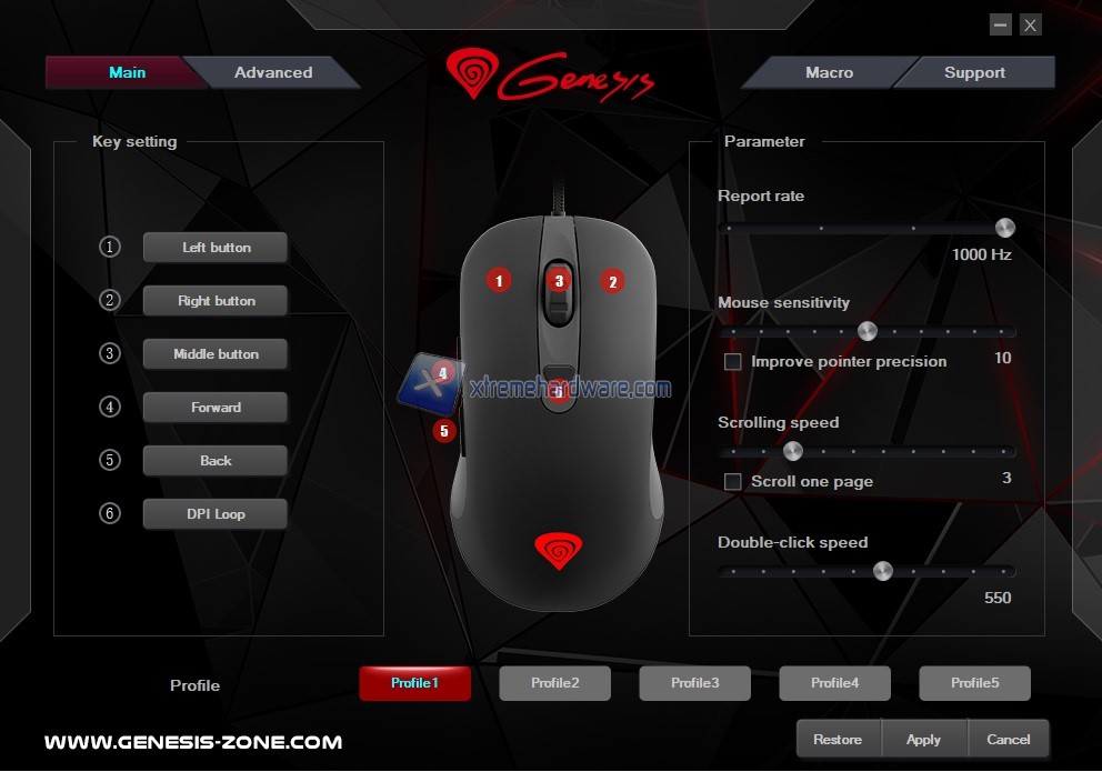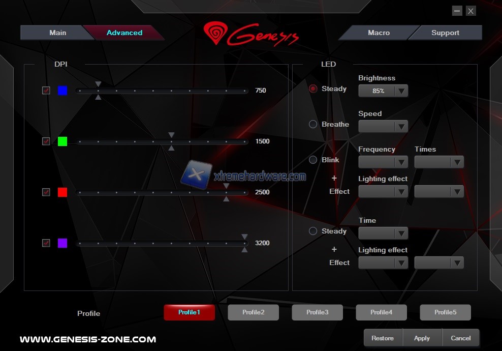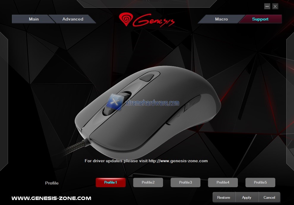 Per poter dunque personalizzare maggiormente il mouse incluso nel Kit dovremo scaricare dal sito della Genesis il pacchetto driver&software. Una volta installato ci basterà avviarlo per accedere al software di gestione. Software con una GUI a tema Genesis (Nero e Rosso) e facilmente intuibile.