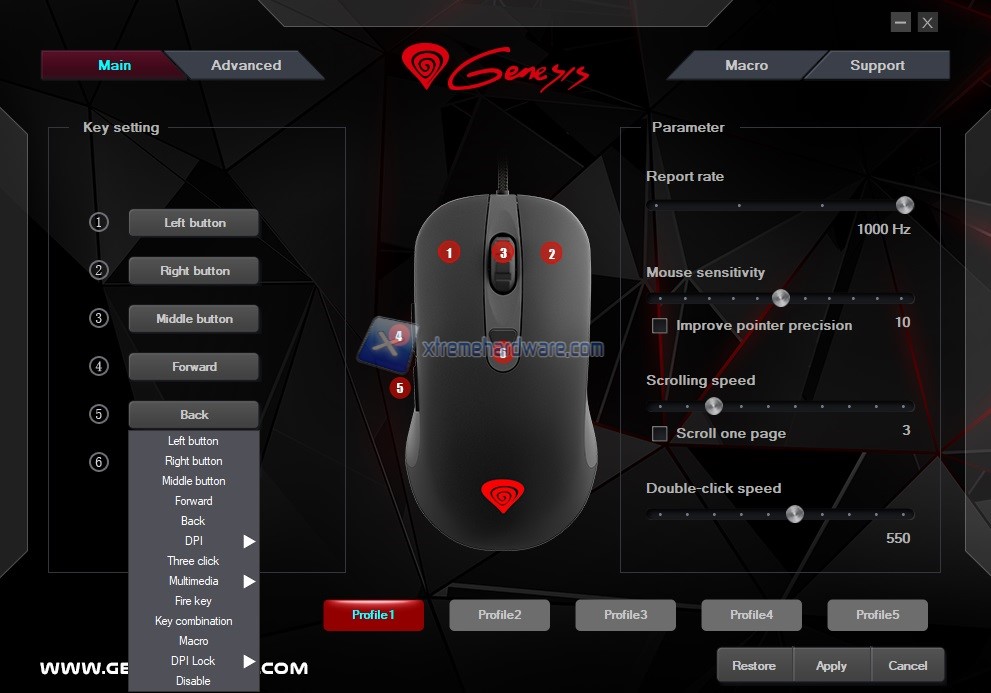 Il software si basa su quattro Menù che sono ‘’Main’’, ‘’Advanced’’, ‘’Macro’’ e ‘’Support’’. Non mancano 5 Profili presenti nel lato inferiore della GUI con cui potremo creare diversi Profili a seconda del gioco o applicazione.
