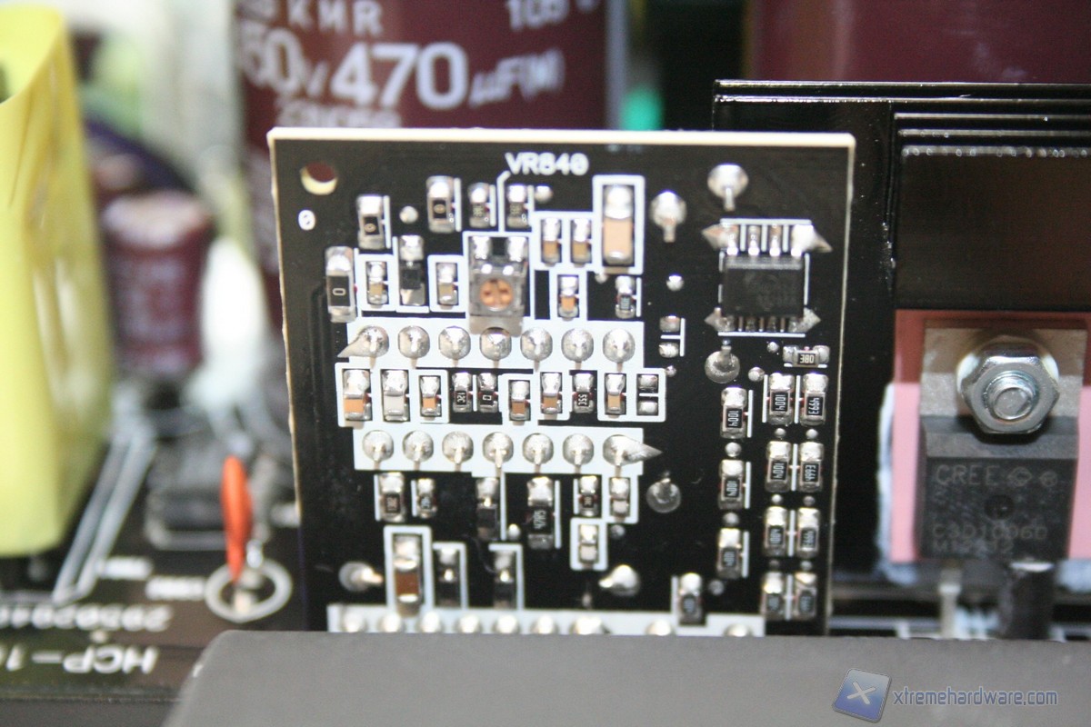 Oltrepassando il primario, la faccenda si complica ulteriormente in quanto viene utilizzato una schematica denominata da Antec “PhaseWave Design”; consiste in un design LLC di classe server full-bridge con una “synchronous rectification” basata su di una topologia DC-DC. La complessità di questo sistema è un chiaro indice del fatto che Antec sta presentando una unità che dovrà rappresentare il top per concezione, e quindi saranno necessarie accortezze fuori dal comune, come in questo caso. Questo design ha permesso una grandissima stabilità dei voltaggi e soprattutto un valore di efficienza molto elevato, in tutti i casi riscontrati in laboratorio. Nel secondario quindi sono utilizzati dei moduli DC-DC, oltre ad un elevato numero di MOSFET posizionati su altri elementi dissipanti. I condensatori sono di entrambe le tipologie ovvero elettrolitici (PCB verticale) ed allo stato solido (PCB principale). Il controller PFC è un Champion “CM6502S”, specifico per alimentatori dotati di una efficienza molto elevata, e superiore al 90%. Il PCB delle connessioni modulari è posizionato sulla sinistra e si caratterizza per essere davvero molto complesso, per via della presenza di un elevatissimo numero di componenti tra cui induttori toroidali e condensatori allo stato solito, oltre a elettrolitici.