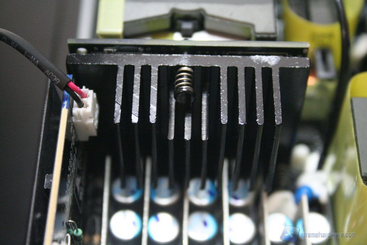 Come abbiamo detto, in questo caso ce ne sono due in parallelo, ed oltre all’elevata capacità presentano anche un voltaggio leggermente maggiore di quello riscontrato fin d’ora in altri modelli. Subito dietro è presente il controller PFC/PWM, situato sulla base con i MOSFETs riposti verticalmente e dissipati passivamente grazie ad un dissipatore in alluminio. Vi mostriamo le fotografie, da notare i MOSFETs TF27S60 ed il diodo Cree C3D1C06D: