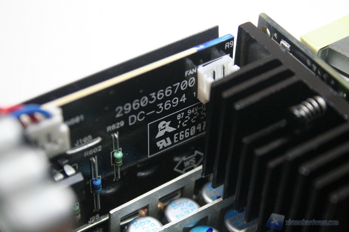 NOTA SINGLE/MULTI RAIL: è meglio single o multi-rail ? Il problema sarebbe un tantino complesso da affrontare perché sarebbero molti i parametri da discutere ed approfondire, però con alimentatori di fascia alta generalmente non c’è differenza. Il fatto che ci siano Single Rail, specifiche e dedicate, porta ad una generale ripartizione migliore dei cavi, e della corrente in uscita, rispettando quindi la specifica Intel nella ripartizione della potenza. Molti alimentatori multi rail in realtà non sono altro che single rail con saldature più o meno curate. Gli alimentatori Single Rail sono molto apprezzati per l’overclock estremo in quanto spesso si eccedono le limitazioni imposte dallo standard ATX sulla singola linea. In questo caso però siamo dinanzi ad un alimentatore Single Rail; quanto detto precedentemente corrisponde al vero, però bisogna anche ricordarsi che Intel stessa specifica che gli SMPS dovrebbero avere sistemi multi-rail con corrente massima di 20A per canale. In questo caso siamo dinanzi ad un valore pari al doppio, però c’è da notare che la ripartizione per connettori ed uscite è esemplare, indi per cui non si avrà il minimo problema in nessun caso.