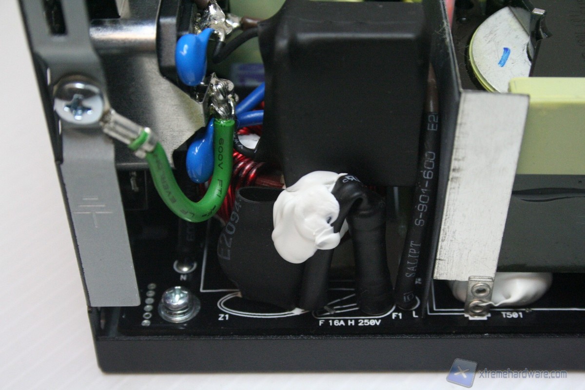 Il primo elemento di un alimentatore moderno è il sistema di filtraggio delle emissioni elettromagnetiche e radio, precisamente l’EMI/RFI Transient Filter. Viene posizionato necessariamente dietro all’ingresso della corrente AC ed in questo caso sono presenti due condensatori ad Y ed uno ad X. Nel PCB principale invece la situazione si complica in quanto sono presenti un elevato numero di condensatori ad Y, due induttori toroidali ed un MOV (MOV: Metal Oxide Varistor).