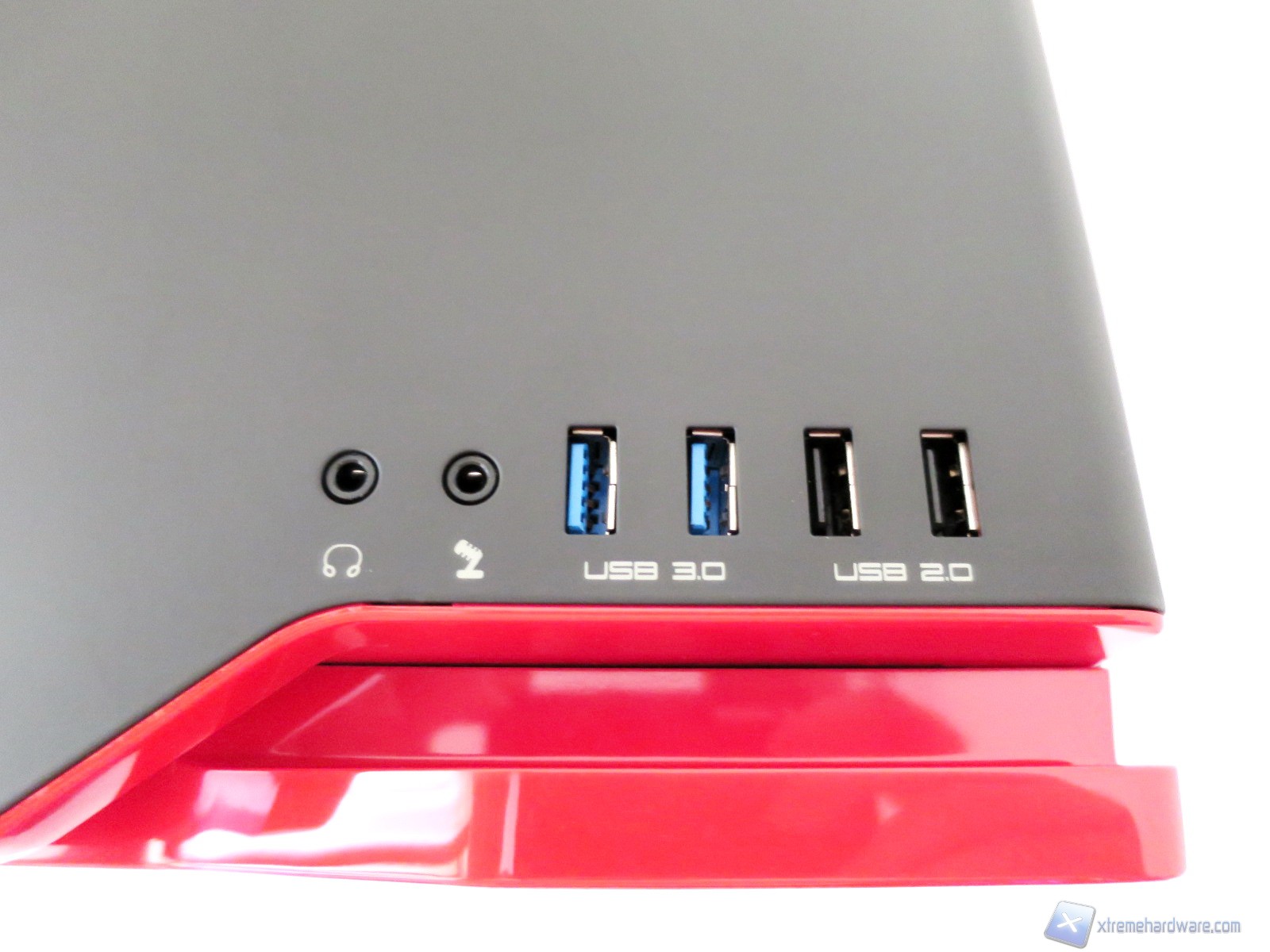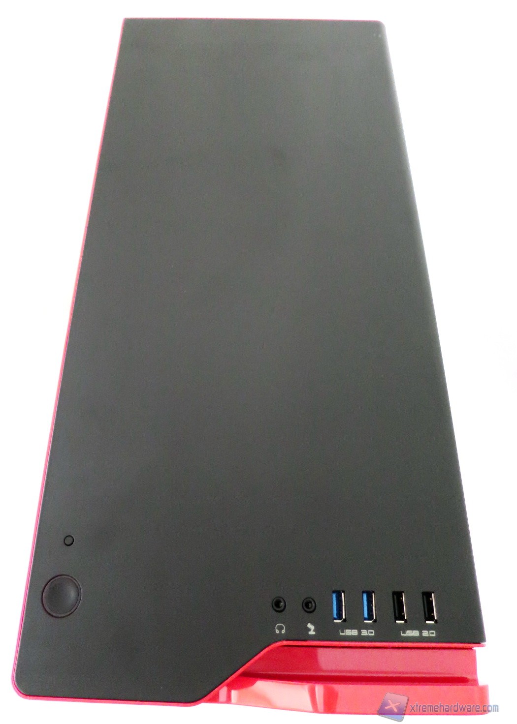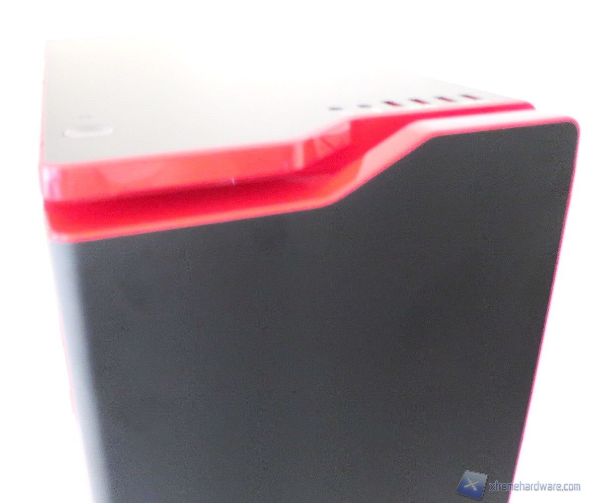 Passiamo dunque all’analisi del frontale dell’NZXT H440 che è una delle cose che colpiscono subito l’utente. Infatti non è comune tra la stragrande maggioranza dei case in commercio trovare un modello privo di bay per unità ottiche. NZXT è sicuramente tra i primi brand attualmente a presentare un case Mid-Tower con un Front Panel privo di bay esterni. Tale soluzione spesso si è vista anche in modding di case dove i modder cercavano una linea minimalista della struttura, portando dunque l’attenzione all’interno del case. NZXT a quanto pare ha intrapreso tale strada proponendo l’H440 come un case che si avvicina molto alla filosofia di un modder. Privando il frontale di bay di espansione, ha aggiunto allo stesso tempo una paratia laterale finestrata che ci invita a guardare all’interno del case per ammirare dunque la configurazione installata. Il frontale compensa la mancanza di bay con una superfice quasi soft touch e delle griglie laterali che rendono il look dell’H440 davvero aggressivo. Nella parte superiore del case non trovano posto griglie per ventole o radiatori ma viene seguita la linea del front panel, infatti anche nel top del case troviamo una paratia unica e chiusa, anch’essa dotata di superficie soft touch. Troviamo nel top del case soltanto il pulsante di accensione e RESET e le porte di espansione. Nel dettaglio, sono presenti partendo da sinistra i jack da 3,5 millimetri per le cuffie ed il microfono, due porte USB 3.0 (caratterizzate dal classico colore blu) e due porte USB 2.0 per assicurare una piena compatibilità con ogni periferica. Il design e la linea dell’NZXT H440 sono quindi davvero minimalisti, ma al tempo stesso rendono il case elegante e di grande impatto visivo.