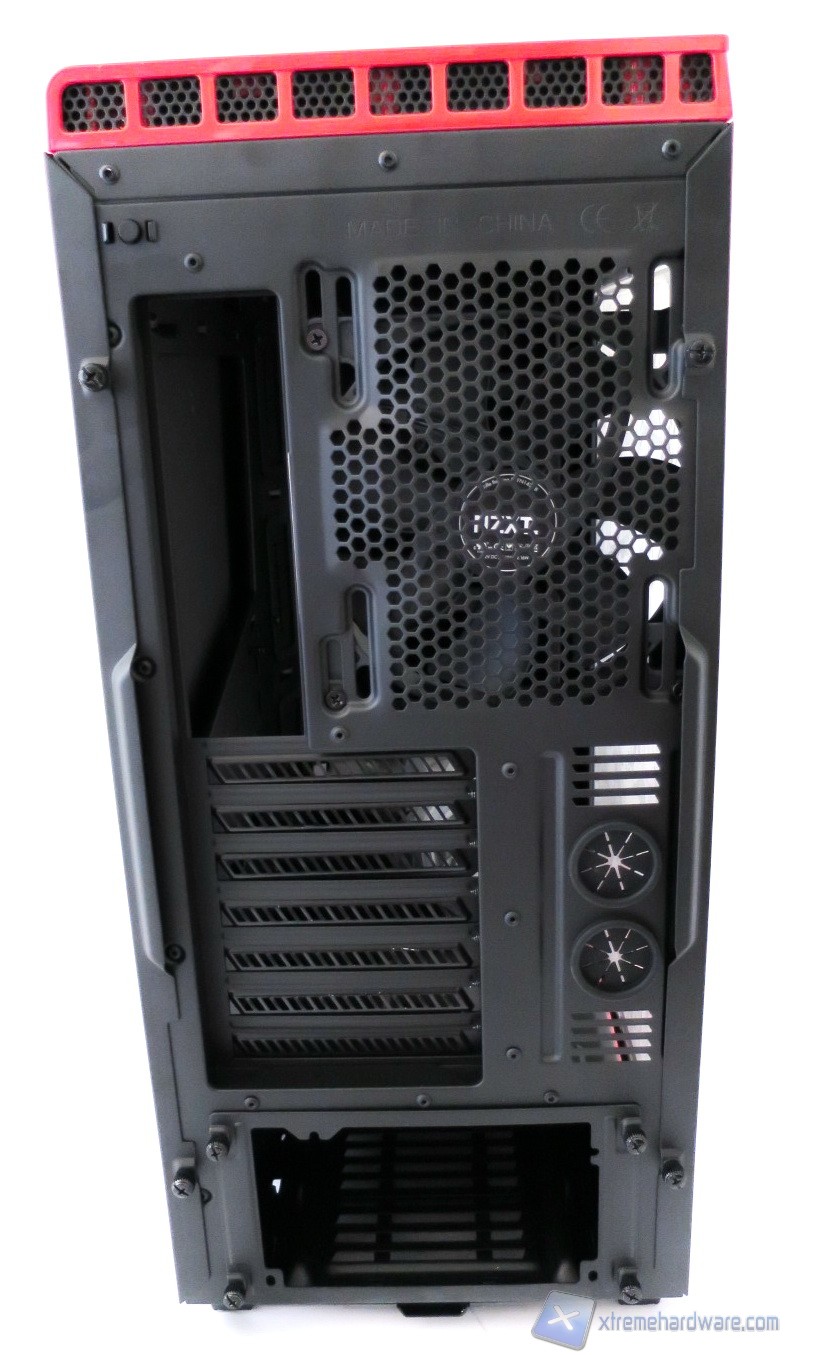 Il retro dell’NZXT H440 è ormai quello classico degli attuali case in commercio dove è ormai standard la posizione della scheda madre nella parte alta del case e dell’alimentatore nella parte bassa. Analizzandolo nel dettaglio, spicca parte della griglia del pannello superiore, a seguire il foro per l’installazione dell’I/O Shield della scheda madre. Poco sotto trovano posto i 7 slot PCI perforati per l’installazione delle schede video o altre schede di espansione. Come sempre con questa tipologia di slot potrebbe essere presente il fenomeno del “negative loop” orizzontale, tale per cui le temperature della scheda grafica possono aumentare a causa del potenziale ricircolo di aria calda dall’esterno. Ciò si verifica quando c’è un fenomeno di pressione negativa, ovvero sbilanciamento tra ventole in estrazione e in immissione, in favore delle prime. Questo problema non dovrebbe comunque essere presente nell’H440, in quanto le tre ventole in immissione presenti dietro al pannello frontale hanno una buona pressione statica e comunque spingono ariain prossimità dell’alimentatore, delle schede e del top della scheda madre garantendo un ottimo flusso d’aria. Detto questo trovano posto a lato dei 7 slot PCI due piccole griglie e due passatubi rivestiti di gomma. Inoltre i 7 slot sono facilmente removibili tramite una semplice vite di ritenzione. Infine troviamo il supporto per l’alimentatore in formato ATX. NZXT ha deciso di impiegare un supporto amovibile da fissare prima all’alimentatore e solo successivamente al case. Questa scelta è stata a fatta anche in ottica del midplate chiuso e non removibile presente all’interno del case che limiterebbe completamente la possibilità di gestione ed installazione della PSU. Ultima chicca presente nel retro del case è un piccolo pulsante nell’angolo alto sinistro che, una volta collegato il connettore Molex, lo stesso del Fan HUB, ci permetterà di accendere o spegnere un LED posto nelle vicinanze della I/O Shield. Ma vedremo il tutto nel capitolo dell’installazione e montaggio.