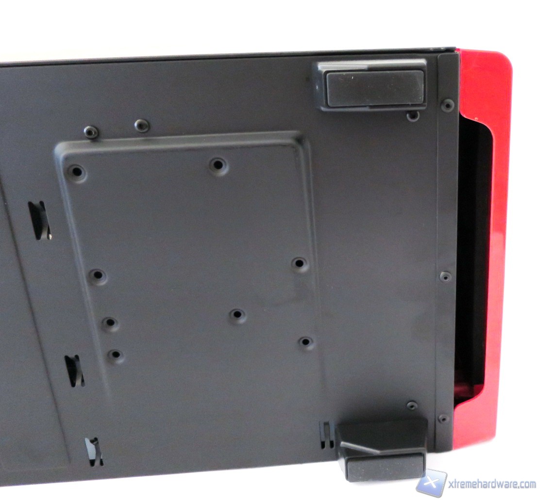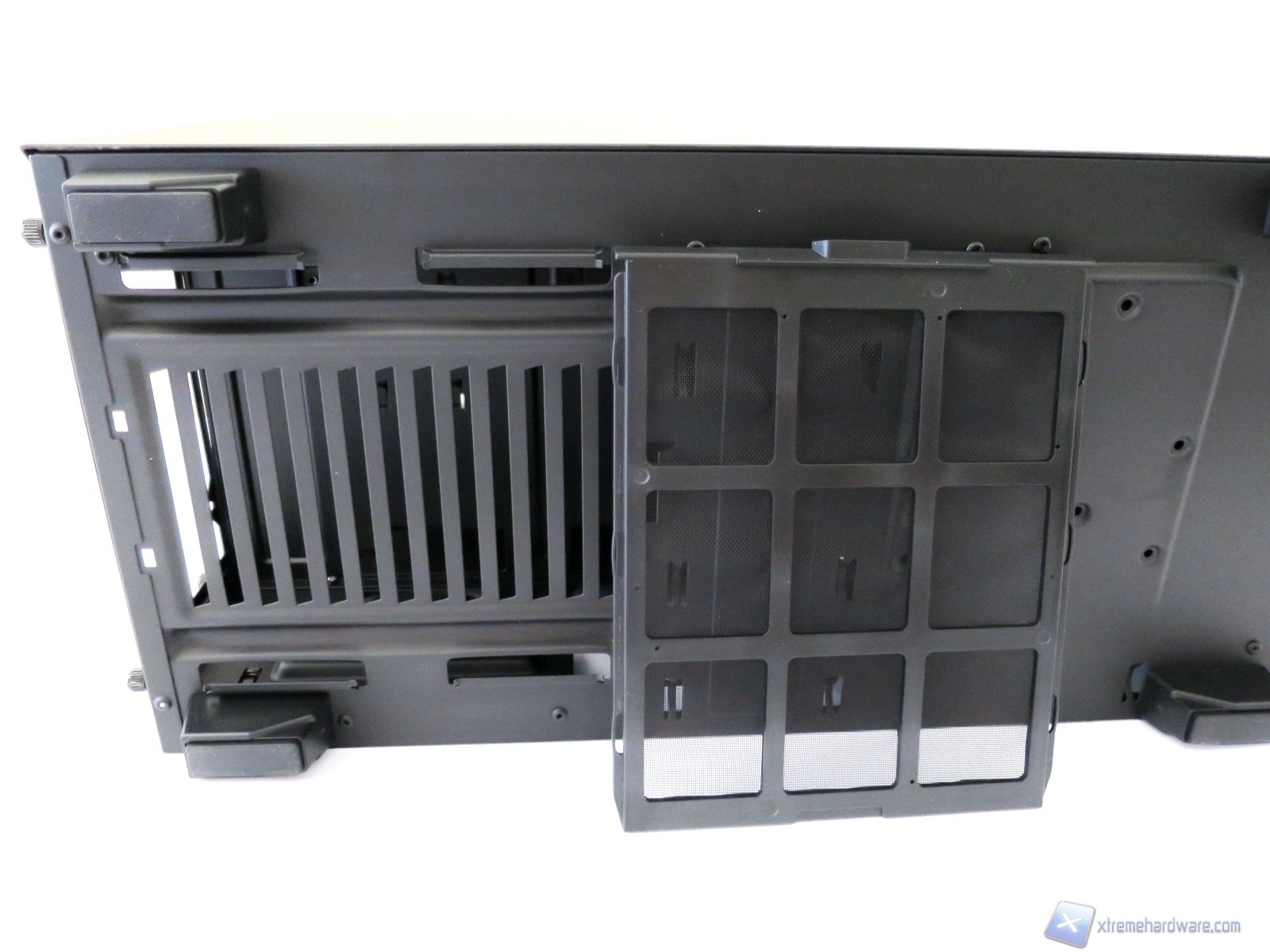 La paratia inferiore dell’NZXT H440 è dotata di un generoso filtro antipolvere (removibile e lavabile) e relativa griglia in corrispondenza della ventola dell’alimentatore. Questa griglia ovviamente serve a prevenire l’afflusso di polvere all’interno dell’alimentatore. La restante superfice inferiore non è caratterizzata da nient’altro. I piedini impiegati nell’NZXT H440 sono dotato di un rivestimento in gomma per assicurare un’ottima presa sulla superfice di appoggio ed hanno anche una buona altezza che permetterà di avere un adeguato flusso d’aria e ricircolo.