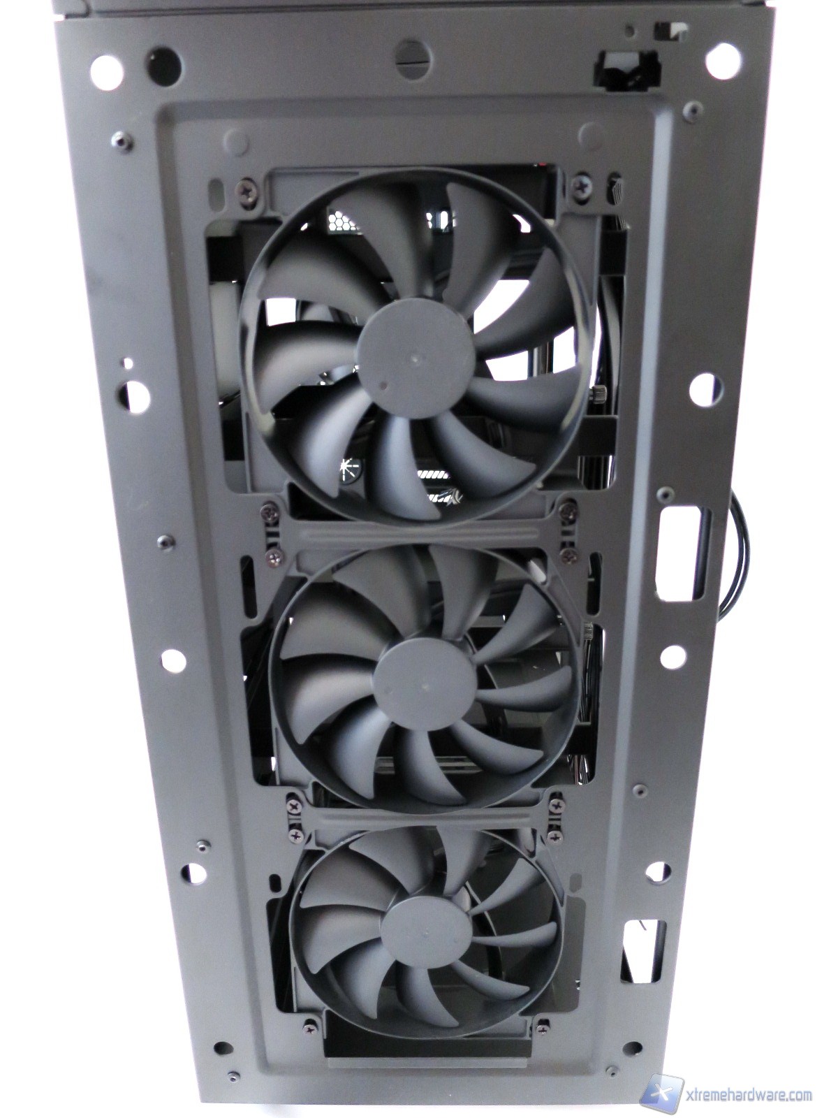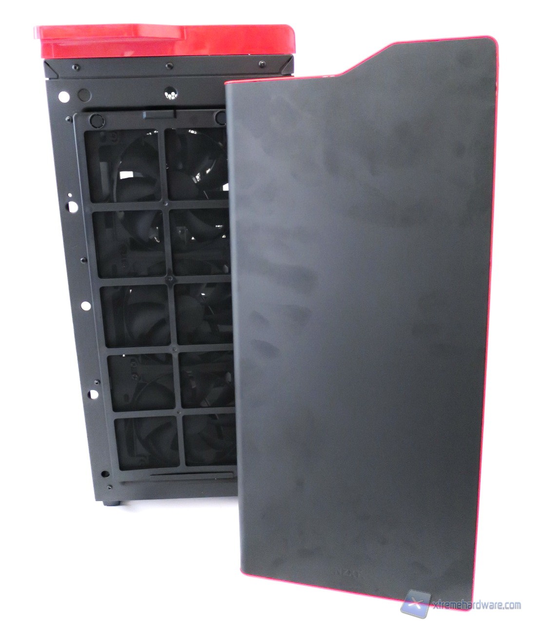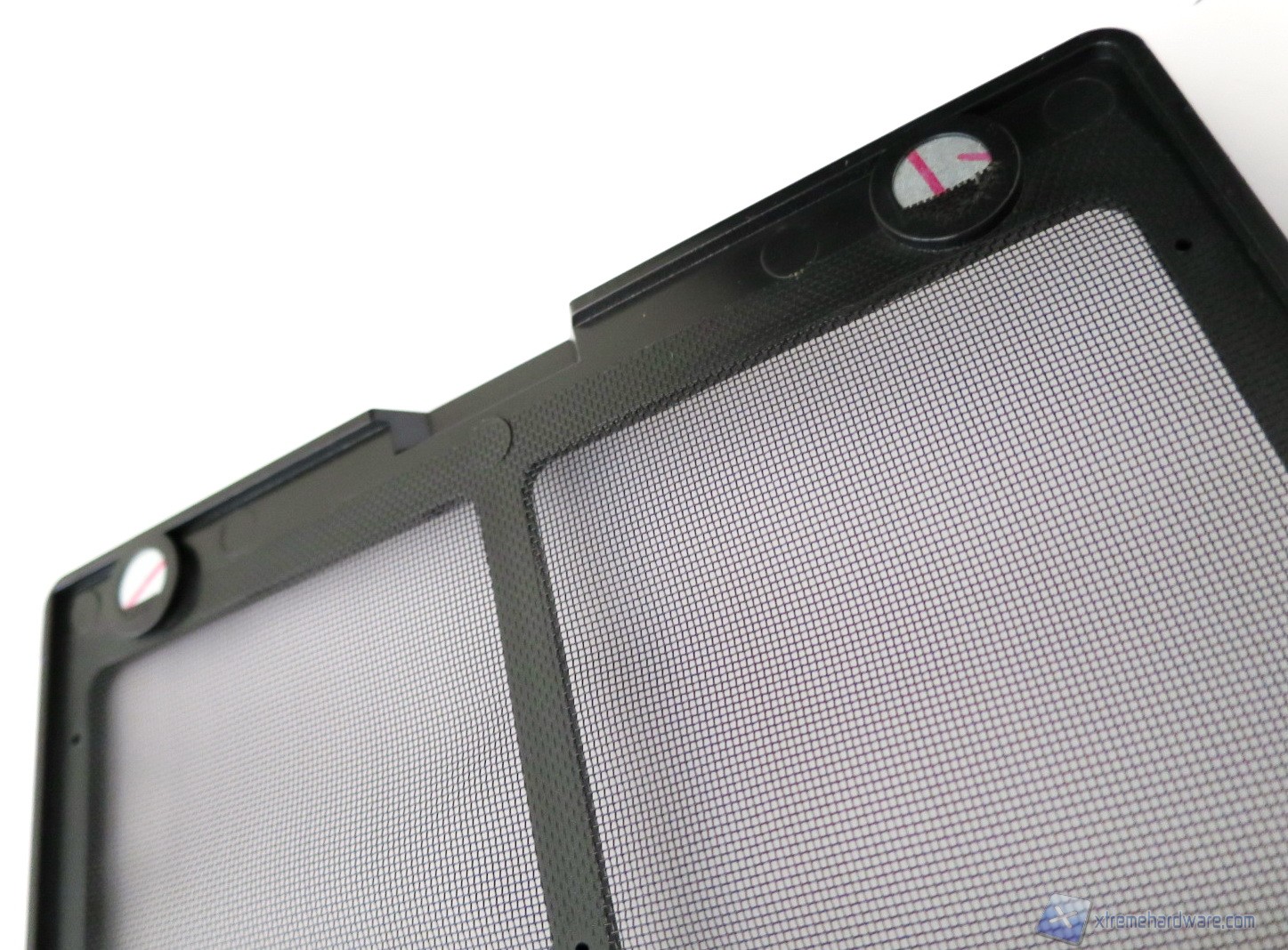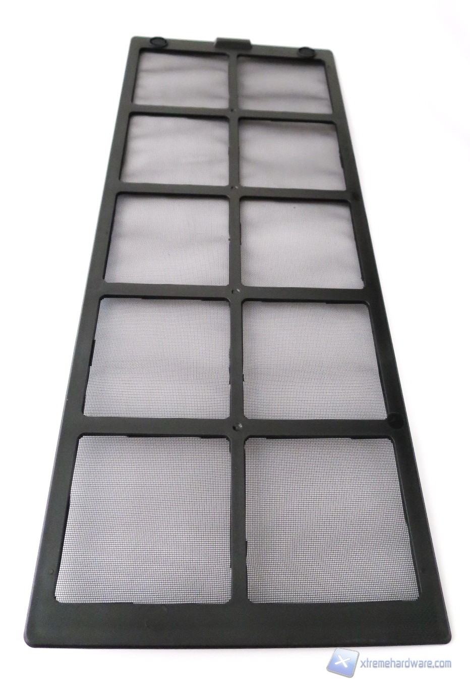 Inoltre, vi mostriamo il pannello frontale con relativa griglia e filtro smontati e il frontale dove sono installate le ventole NZXT FX V2 da 120 millimetri. Infatti NZXT, pur sacrificano griglie e bay esterni, ha voluto massimizzare il flusso d’aria con ben tre ventole da 120 millimetri in configurazione Push. Il generoso filtro antipolvere, permette di limitare l’ingresso della polvere proveniente dalle griglie poste lungo il perimetro del pannello frontale.
