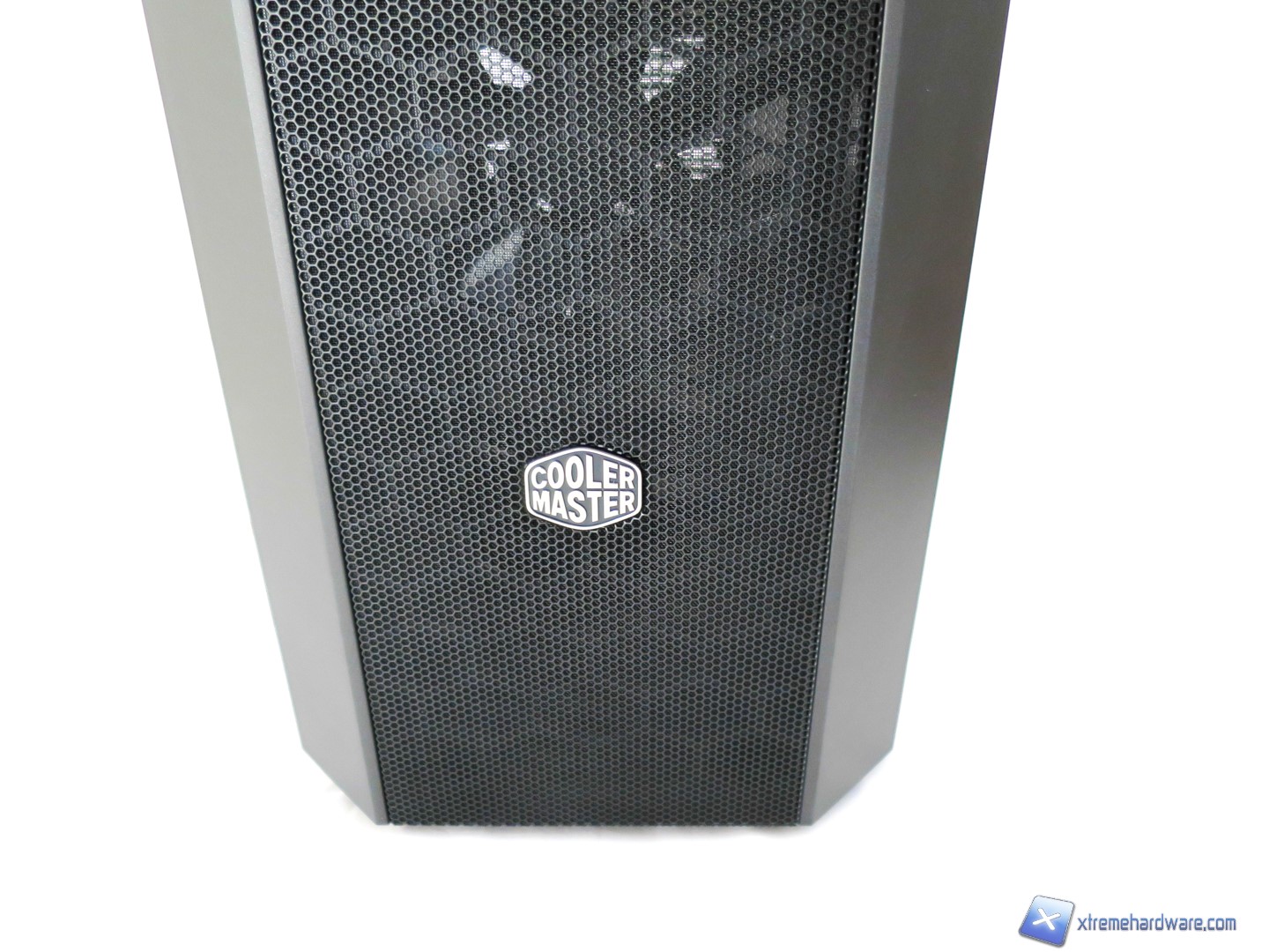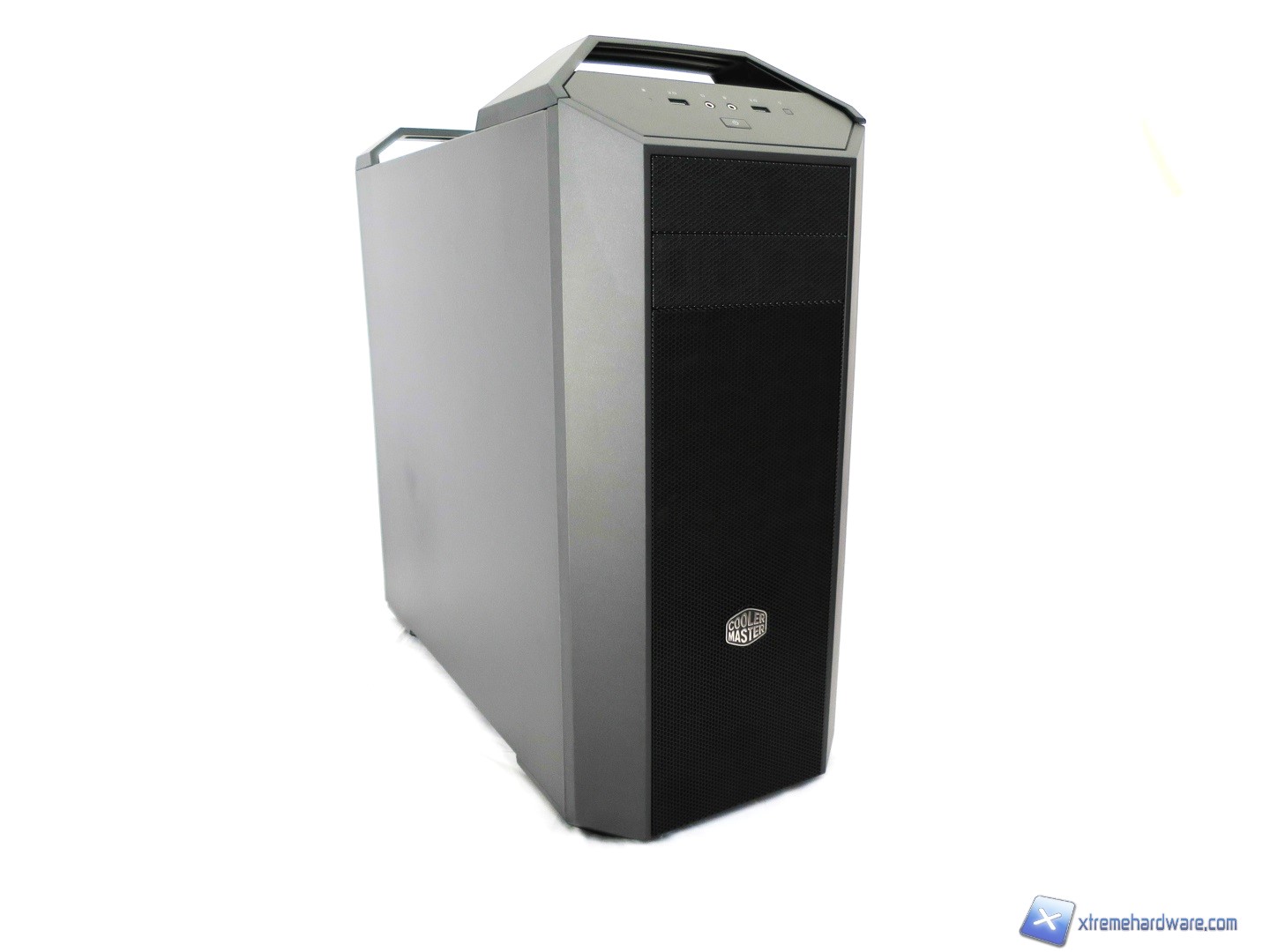 Partiamo come di consueto l’analisi del MasterCase 5 dal frontale il quale è caratterizzato da una generosa griglia mesh in metallo che percorre l’intera altezza. Questa è incastonata tra i lati del frontale e la copertura superiore interamente in solida plastica. Notiamo inoltre come il design scelto trasmetti immediatamente senso di solidità e compattezza. Immancabile ovviamente il logo di Cooler Master incastonato nella griglia inferiore e non semplicemente incollato come spesso notiamo in altri prodotti. Cooler Master è sempre molto attenta ai dettagli ed alla qualità e in questo MasterCase 5 lo notiamo immediatamente. Proseguendo verso la parte alta sempre del frontale troviamo quasi una plancia con tutti gli ingressi e tasti classici dei case. La superficie ove risiedono è di generose dimensioni ed ha una forma quasi ovale ma si notano subito le linee nette e pulite. Per i più attenti sicuramente tale frontale/superficie ricorderà quella del Cooler Master Trooper da cui eredità sicuramente la griglia mesh metallica e la collocazione delle porte ed ingressi.