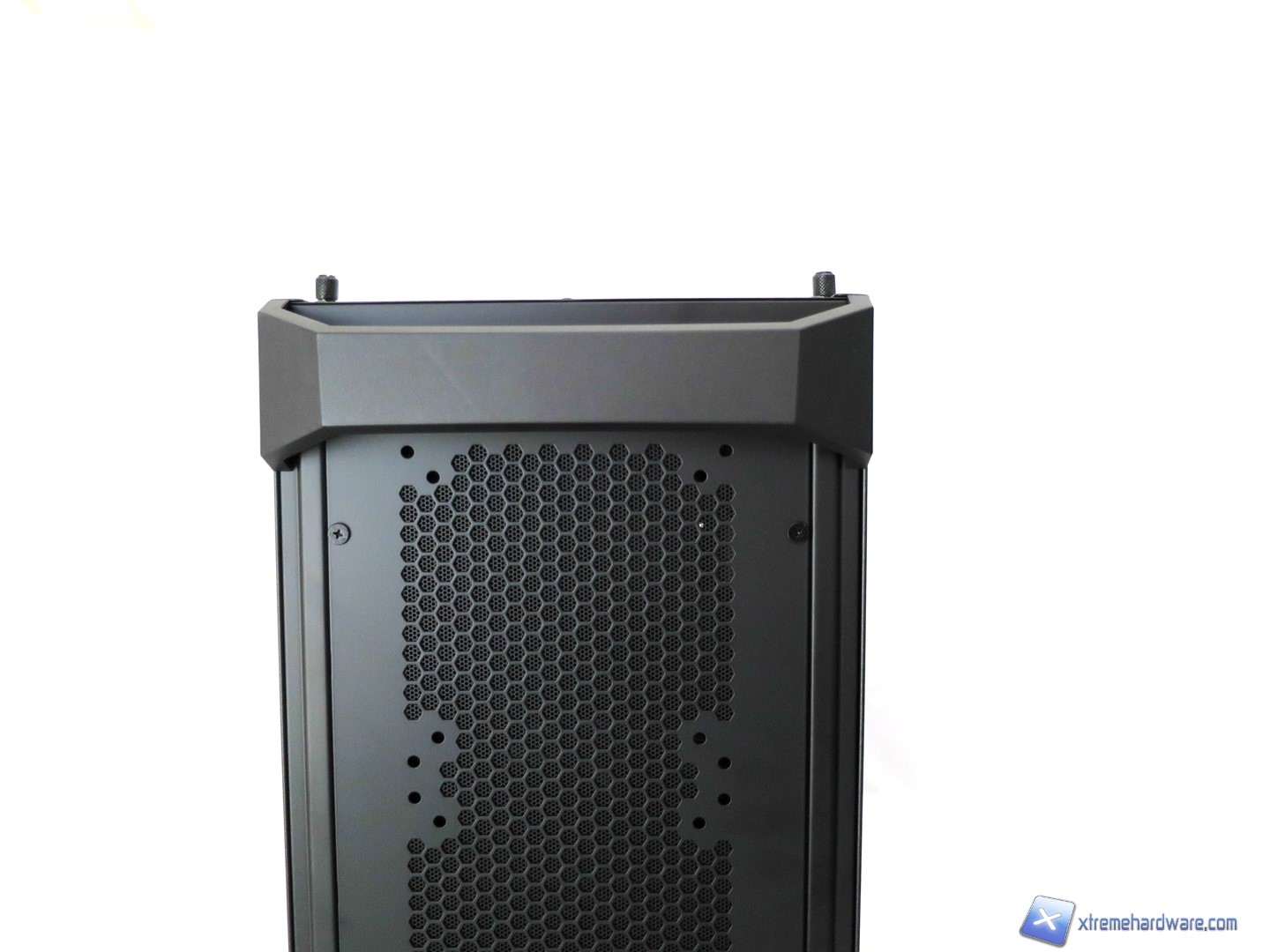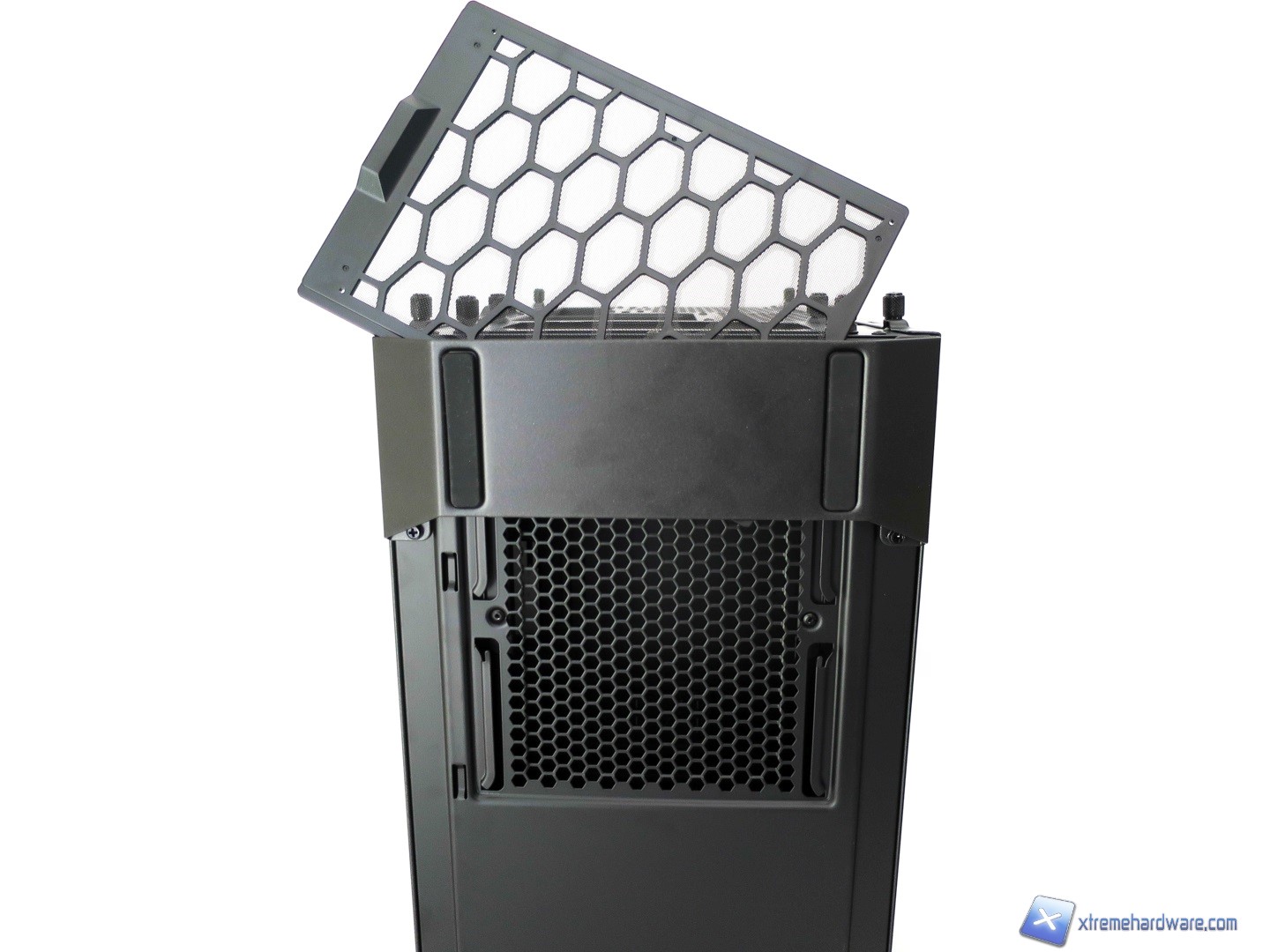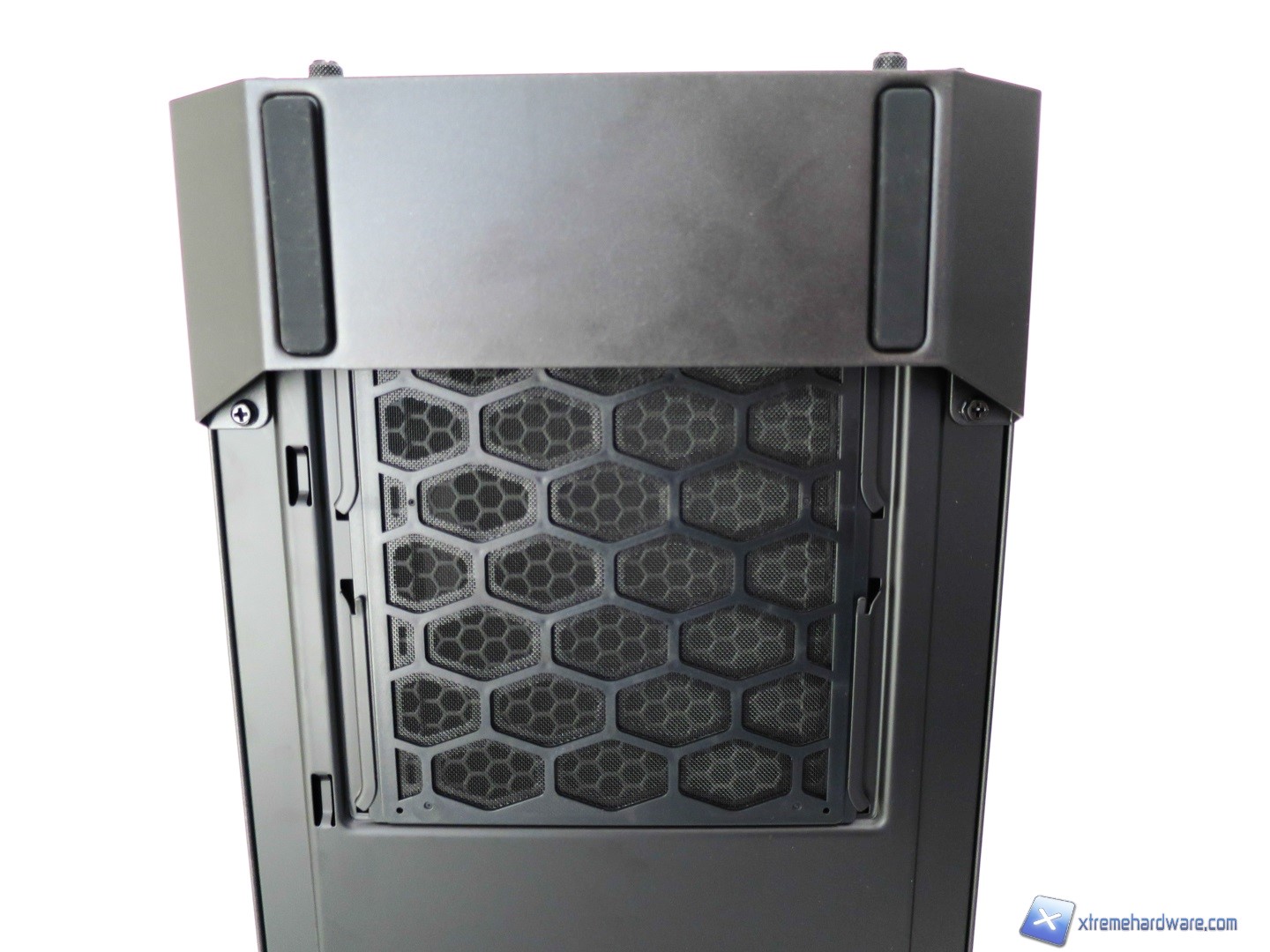 Proseguendo verso il Top del case osserviamo come questo sia caratterizzato principalmente da due maniglie in metallo rivestite di una struttura in plastica giusto per mantenere l’aspetto estetico caratterizzato da alternanza di superfici in plastica ed altre in metallo. Tra le due maniglie (removibili svitando due viti per maniglia) troviamo per il modello MasterCase 5 la griglia con relativo filtro di tipo removibile (svitando le quattro viti presenti). Tale griglia nella nostra versione potrà ospitare solo ventole da 120 e/o 140mm. Nel dettaglio potremo montare o due ventole da 120mm o due ventole da 140mm. Questa è l’unica limitazione, in configurazione base, per la zona superiore del modello MasterCase5. Il modello MasterCase Pro 5 essendo dotato di base degli accessori che sarebbero acquistabili a parte per il modello MasterCase 5 permetterà grazie ad un supporto, che si estende verso l’esterno, di installare un radiatore da 240 o 280mm con relative ventole. Non sarà comunque realizzare configurazioni Push/Pull ma solo Push o Pull. Inoltre per coprire tale supporto che potrebbe sembrare antiestetico viene in aiuto una copertura in plastica con griglia mesh in alluminio giusto per riprendere ed estendere il design del frontale del case. Sicuramente per molti tale copertura garantirà un aspetto più lineare del case che nella nostra versione potrebbe ‘’spezzare’’ l’idea e design visivo dato dal frontale. Ad ognuno il giudizio sul design complessivo dei due modelli.