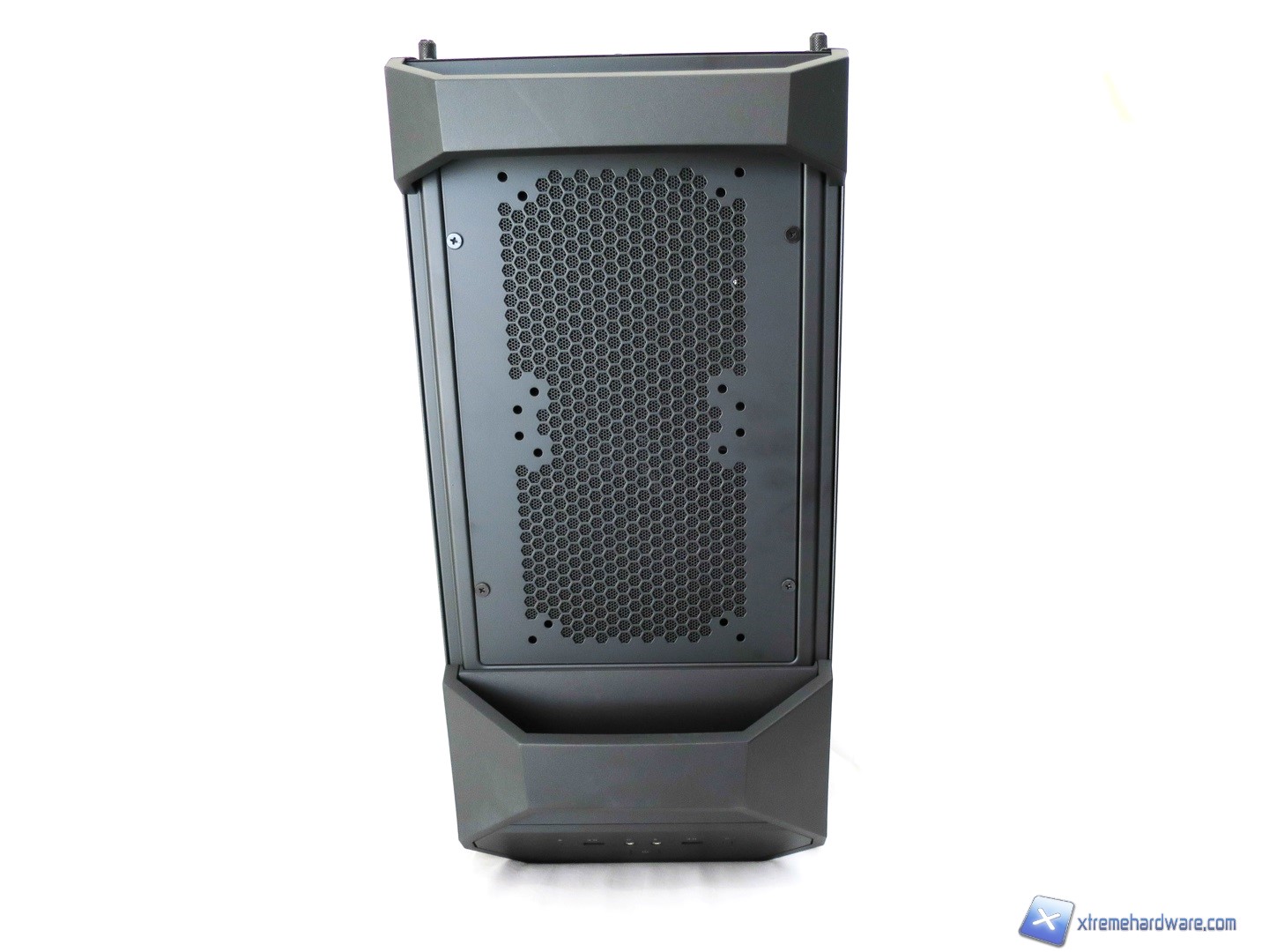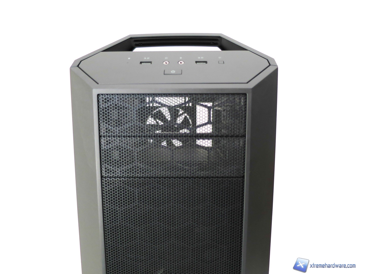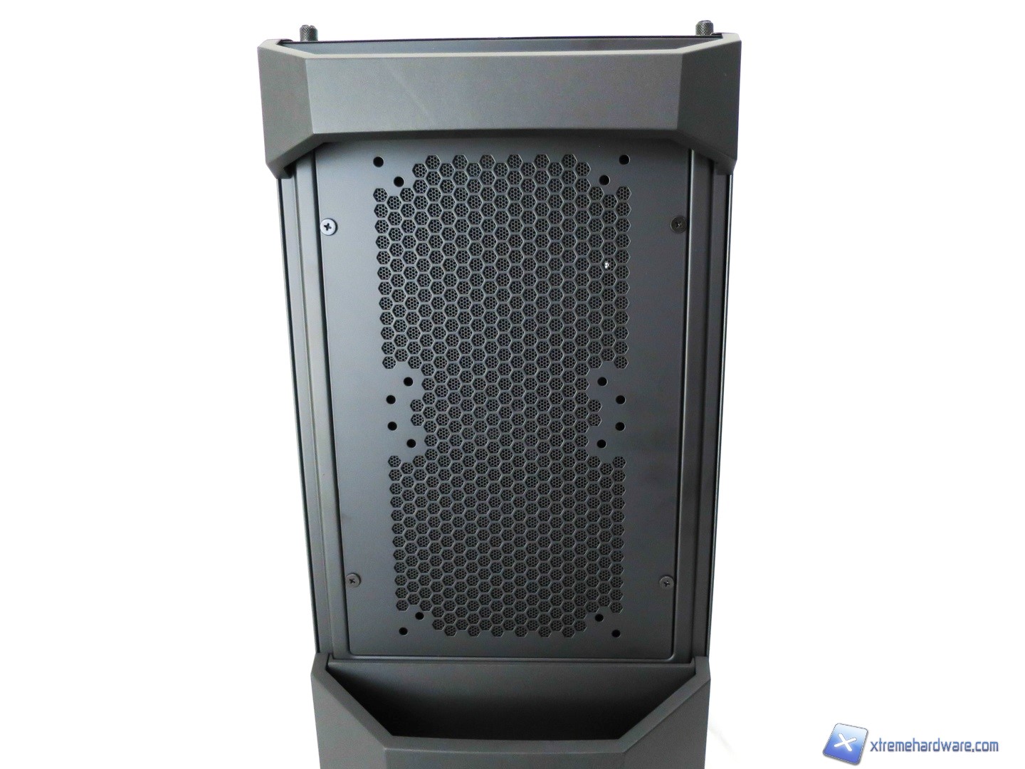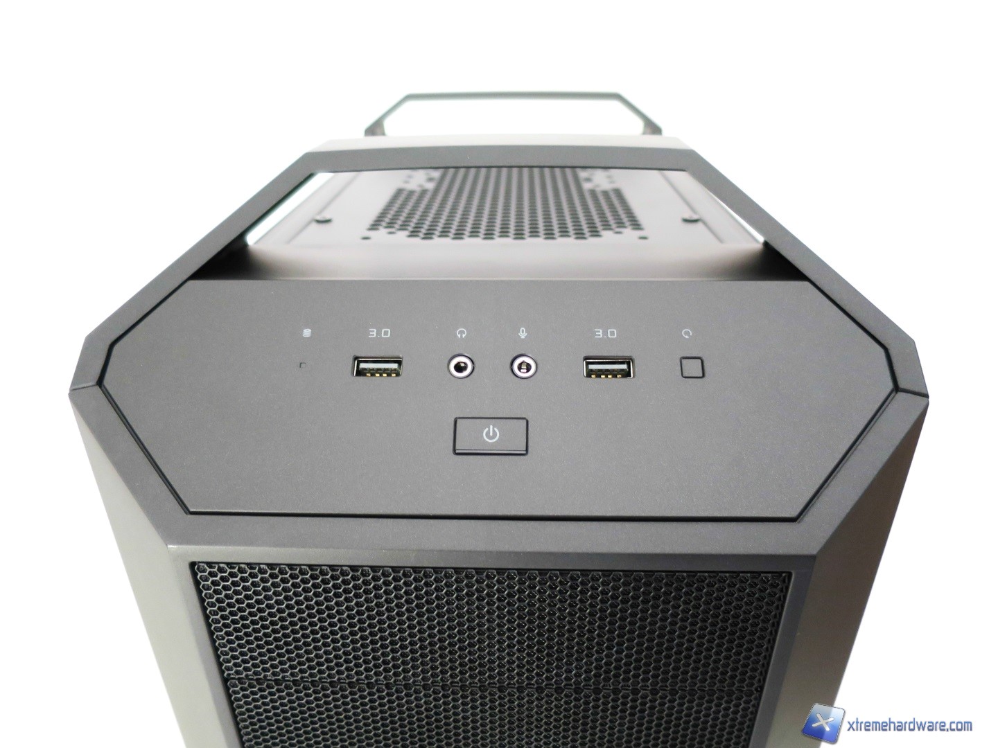 Proseguendo verso il Top del case osserviamo come questo sia caratterizzato principalmente da due maniglie in metallo rivestite di una struttura in plastica giusto per mantenere l’aspetto estetico caratterizzato da alternanza di superfici in plastica ed altre in metallo. Tra le due maniglie (removibili svitando due viti per maniglia) troviamo per il modello MasterCase 5 la griglia con relativo filtro di tipo removibile (svitando le quattro viti presenti). Tale griglia nella nostra versione potrà ospitare solo ventole da 120 e/o 140mm. Nel dettaglio potremo montare o due ventole da 120mm o due ventole da 140mm. Questa è l’unica limitazione, in configurazione base, per la zona superiore del modello MasterCase5. Il modello MasterCase Pro 5 essendo dotato di base degli accessori che sarebbero acquistabili a parte per il modello MasterCase 5 permetterà grazie ad un supporto, che si estende verso l’esterno, di installare un radiatore da 240 o 280mm con relative ventole. Non sarà comunque realizzare configurazioni Push/Pull ma solo Push o Pull. Inoltre per coprire tale supporto che potrebbe sembrare antiestetico viene in aiuto una copertura in plastica con griglia mesh in alluminio giusto per riprendere ed estendere il design del frontale del case. Sicuramente per molti tale copertura garantirà un aspetto più lineare del case che nella nostra versione potrebbe ‘’spezzare’’ l’idea e design visivo dato dal frontale. Ad ognuno il giudizio sul design complessivo dei due modelli.