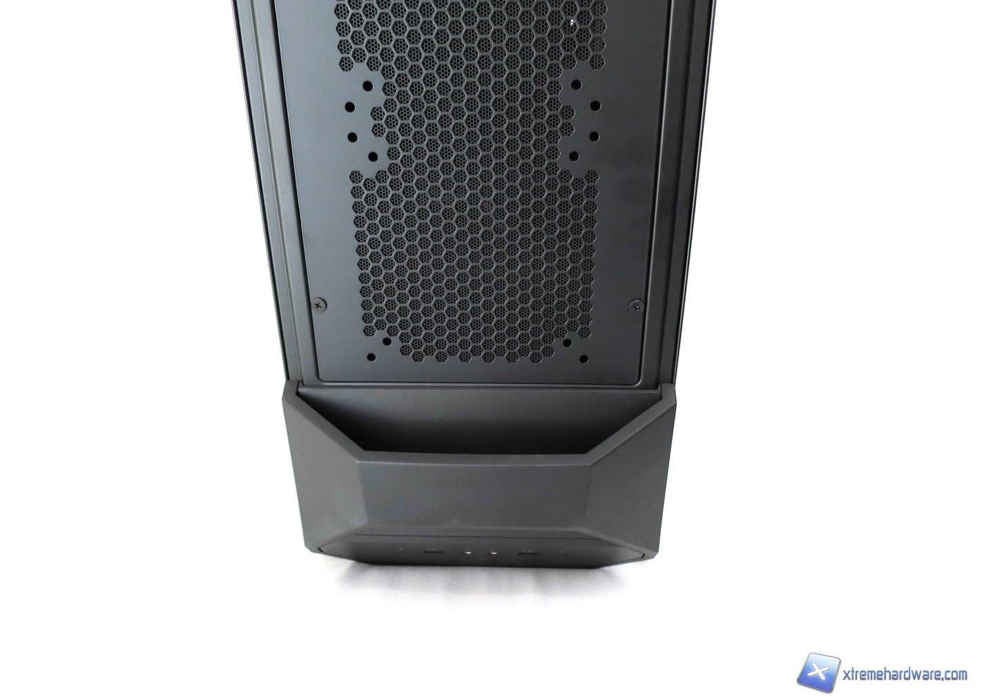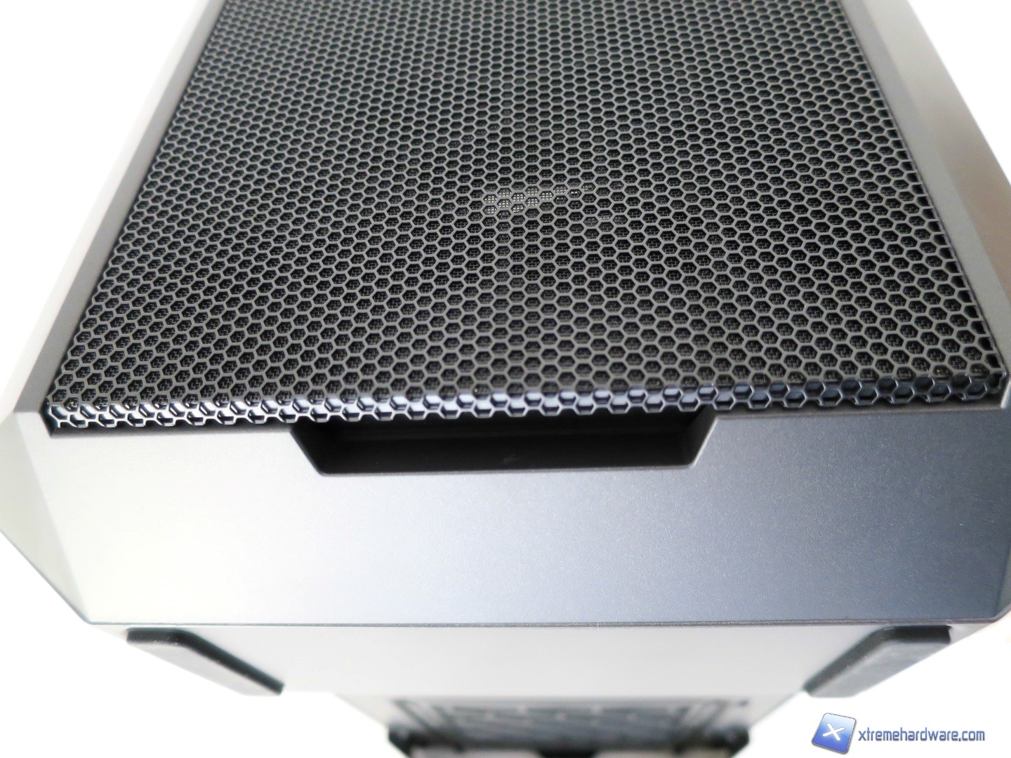 Tornando al frontale intravediamo nella griglia mesh la prima ventola preinstallata da 140mm. Per accedere alla zona dove potremo montare le ventole non dovremo far altro che tirare dal basso e verso di noi tale griglia ovviamente dotata di filtro antipolvere così come i due slot per unità da 5,25’’.
