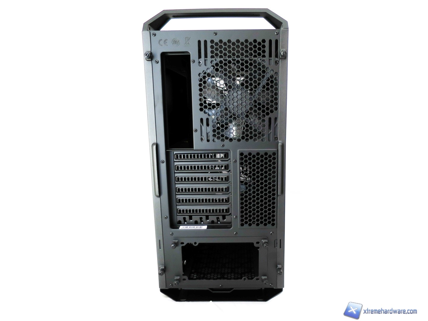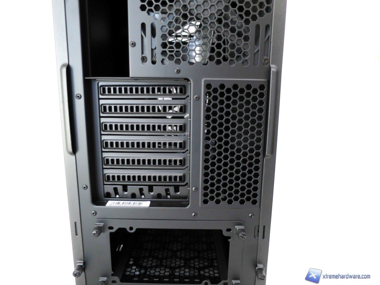 Dalla parte superiore ci spostiamo ora nel retro del case dove troviamo un layout classico ai case di un certo livello e fascia. Nel dettaglio partendo dall’alto troviamo la griglia che ospita la seconda ventola da 140mm che potrà essere sostituita facilmente con un modello da 120mm velocemente grazie a fori guida e non standard. A lato l’immancabile foro ove montare l’I/O Shield della scheda madre. Proseguendo troviamo gli slot PCI-E forati e di numero sette dove l’ultimo è uno slot per sistemare eventuali cavi interni o esterni, mentre a lato è presente una griglia per il ricircolo di aria. Infine, nella parte più bassa, troviamo il foro per l’installazione dell’alimentatore. Questo come visto in altri modelli di altri brand è dotato di un supporto removibile che andrà montato prima sull’alimentatore e dopo ancorato e fissato con viti Tool-less alla struttura.