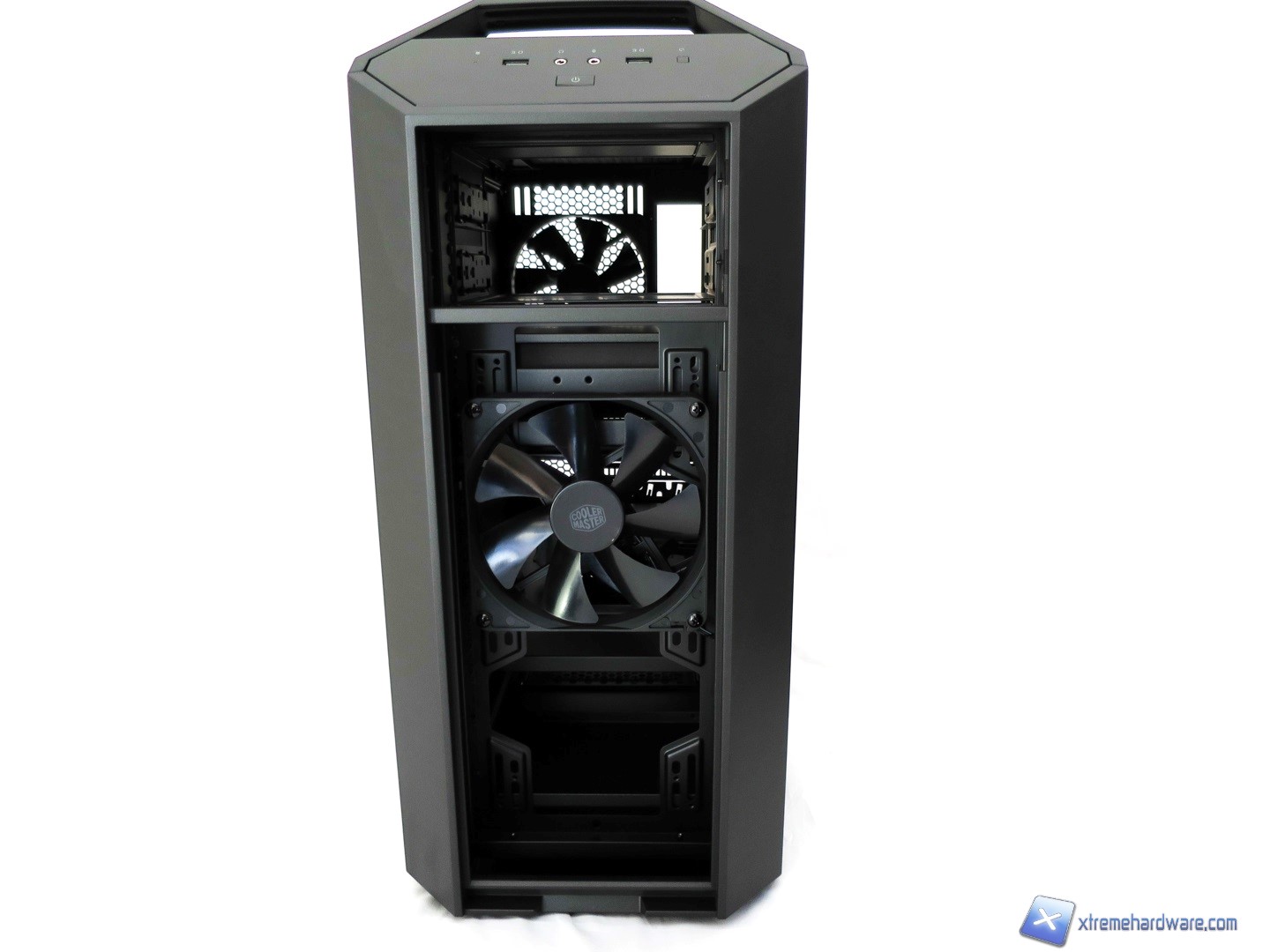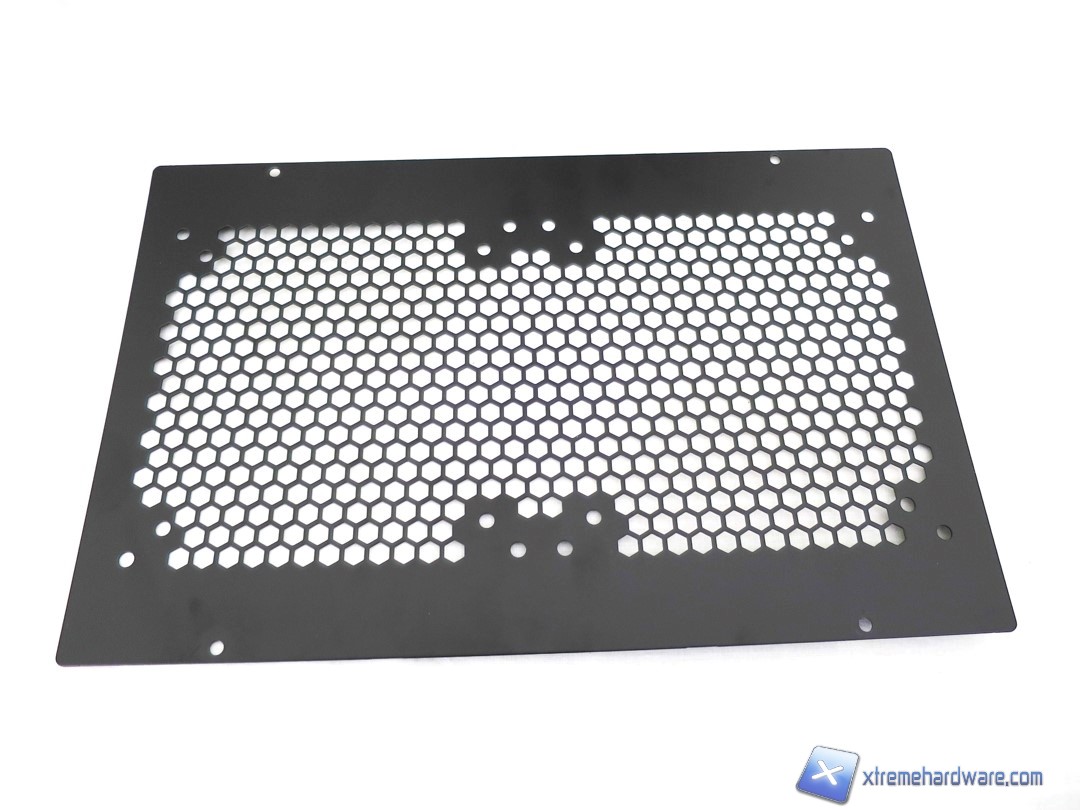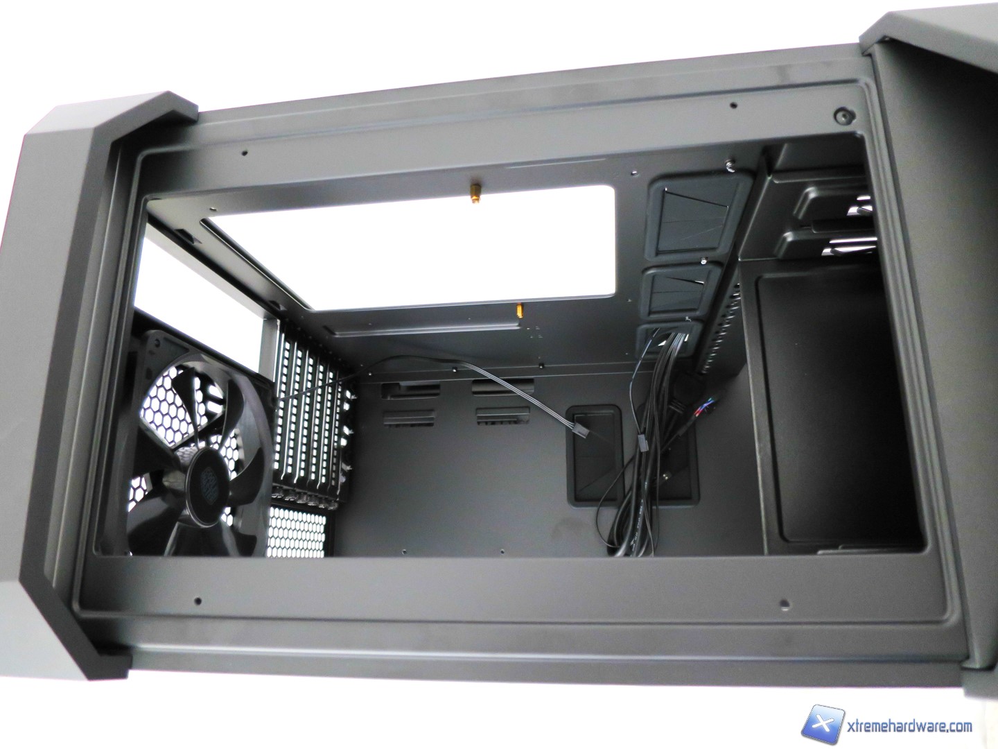 Rimossa la griglia potremo finalmente accedere al vano delle ventole. Cooler Master ha scelto una struttura in metallo per sorreggerle, inoltre non troviamo fori standard perlomeno non per i modelli da 120mm. Per il modello preinstallato da 140mm troviamo fori standard che ci permetteranno di installare due ventole da 140mm o all’occorrenza rimuovendo quella preinstallata da 140 così come gli slot superiore potremo montare fino a tre ventole da 120mm o 140mm grazie ed anche al supporto in bundle da installare nella parte superiore interna. Il MasterCase 5 è un case votato, come detto più volte, al DIY ed al Modding e come vedremo a seguire avremo diverse possibilità di installare radiatori e ventole e dunque creare un sistema a liquido customizzato.