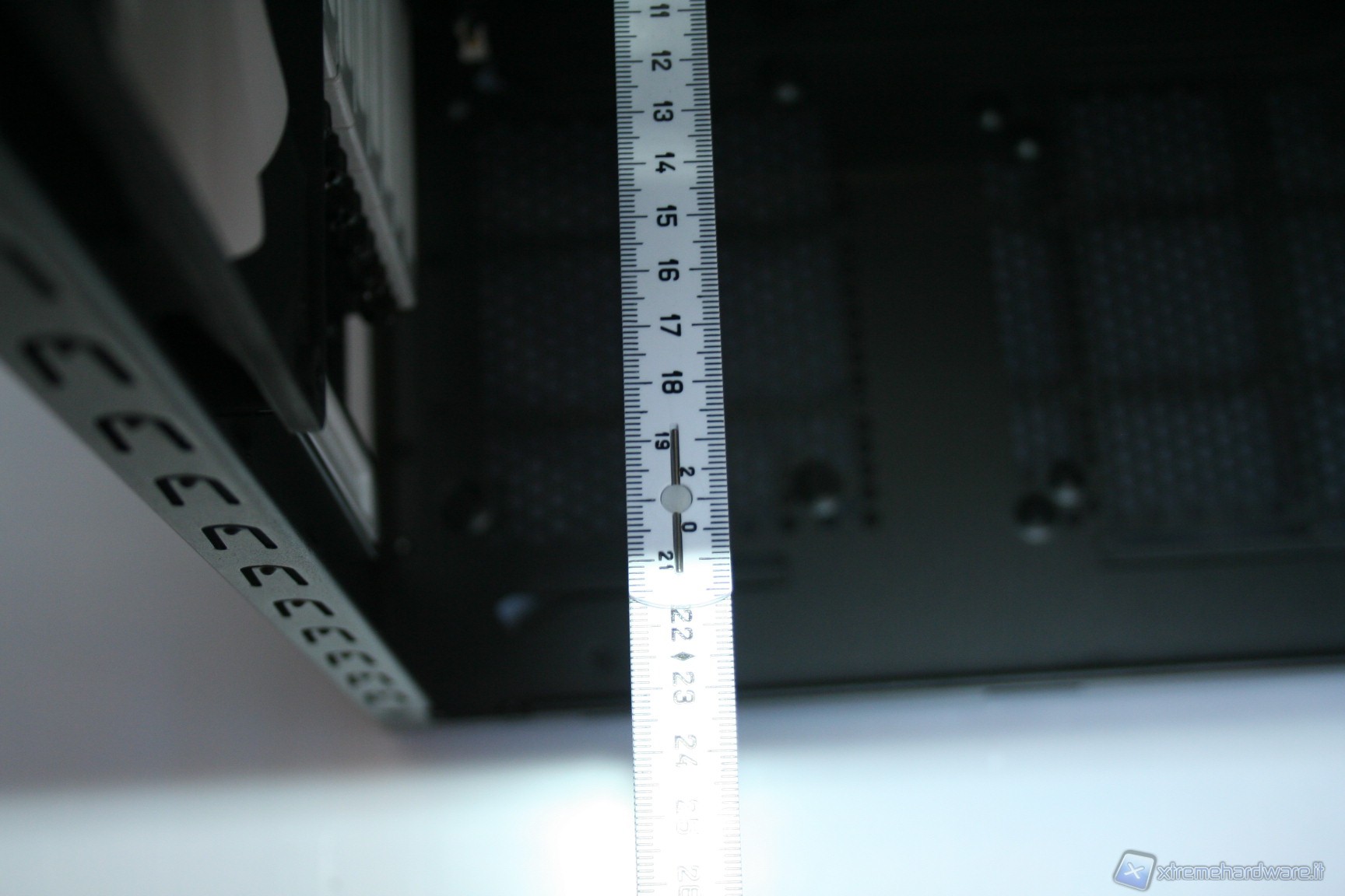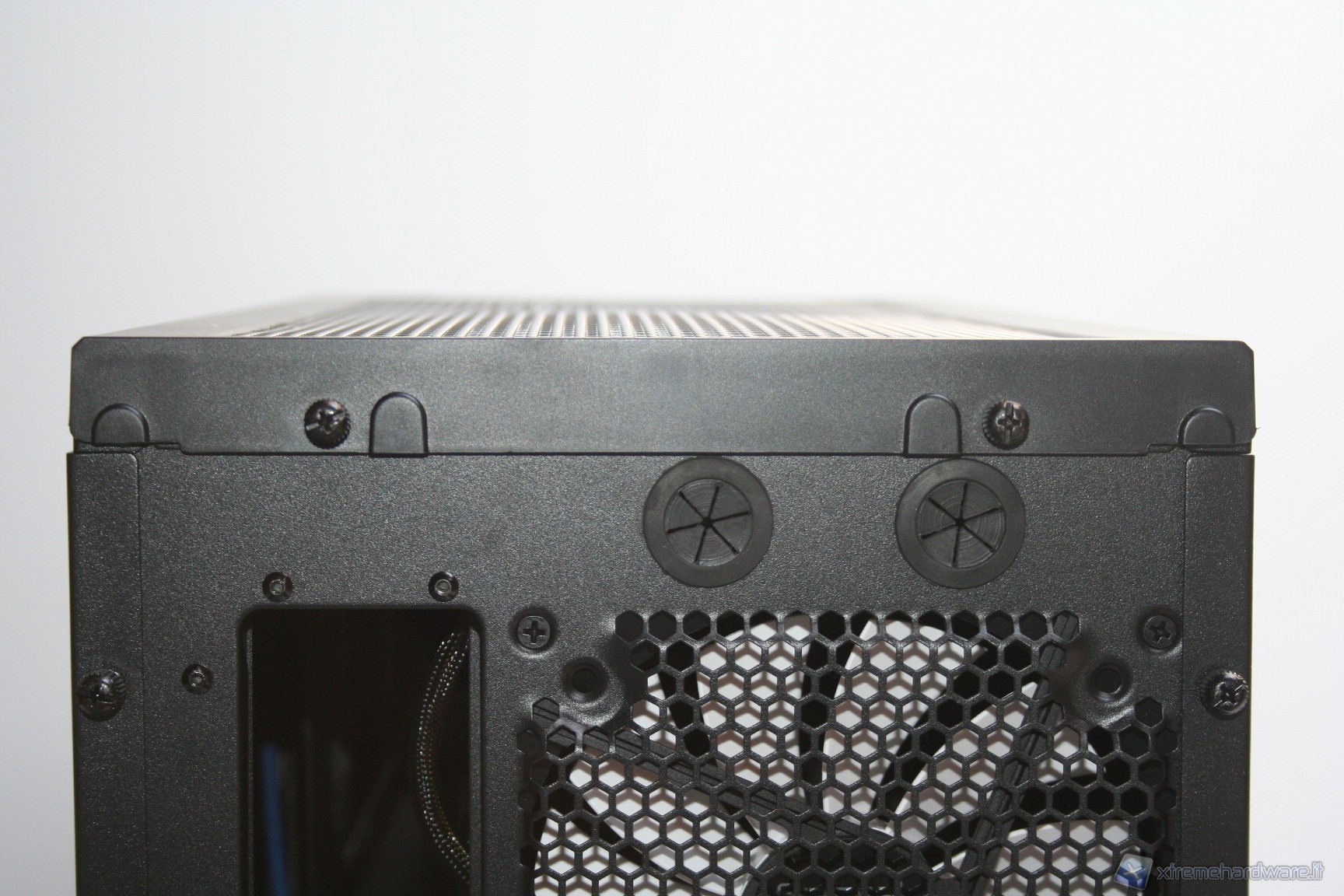 Aspetto determinante in un moderno cabinet è anche la possibilità dell’installazione superiore di radiatori sullo stile Corsair H100. Lo spazio è molto elevato e permetterà un assemblaggio veloce ed immediato, anche con dissipatori ingombranti. Come già detto è presente il foro per il cambio veloce del backplate. Dato il sistema di blocco potrebbero esserci problemi per l’installazione di connettori di alimentazione delle schede madri molto prossimali alla ventola da 120mm in estrazione. Consigliamo l’utilizzo di schede madri con connettori di alimentazione da 4/8 in posizione classica, ovvero superiore.