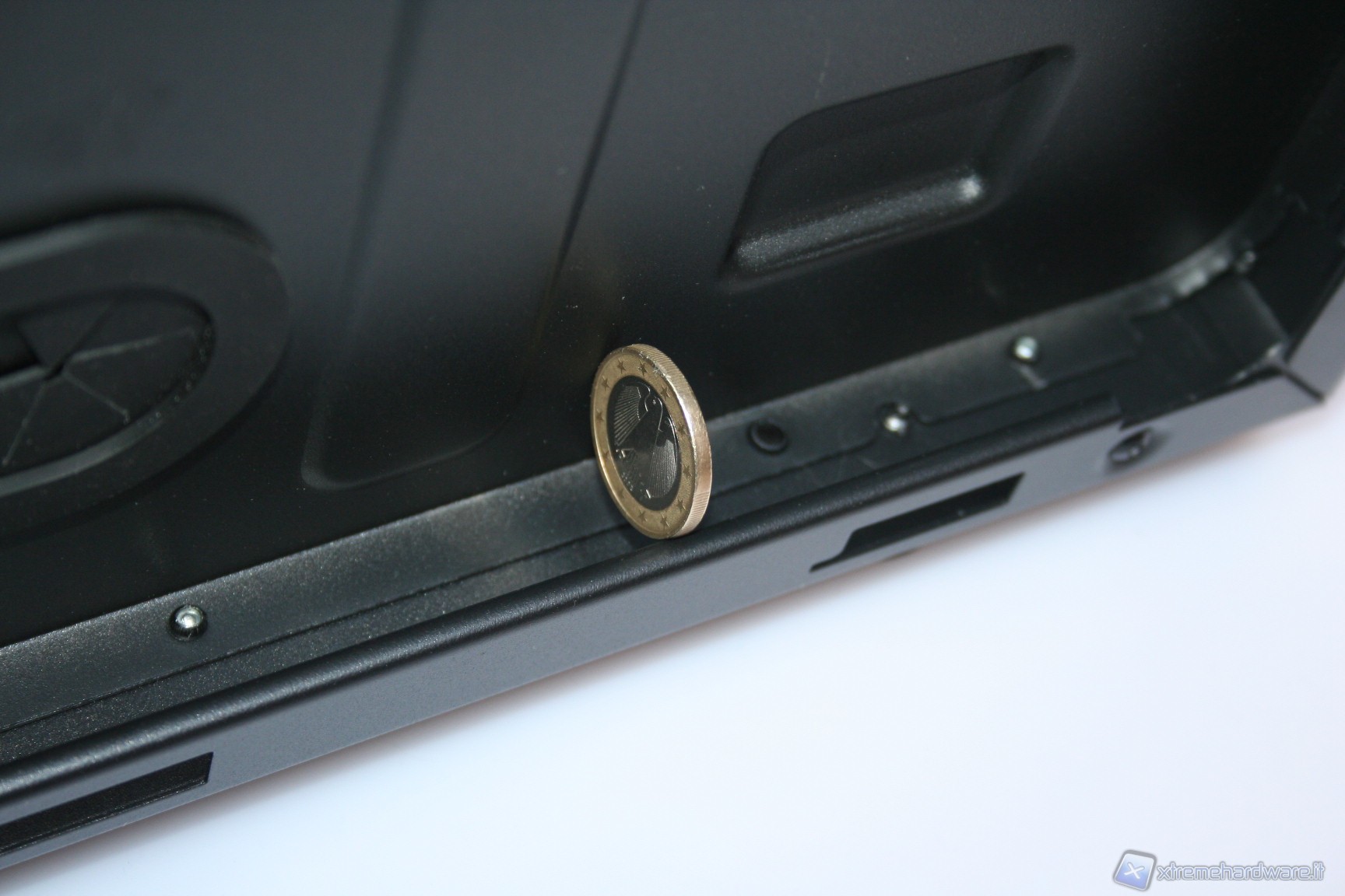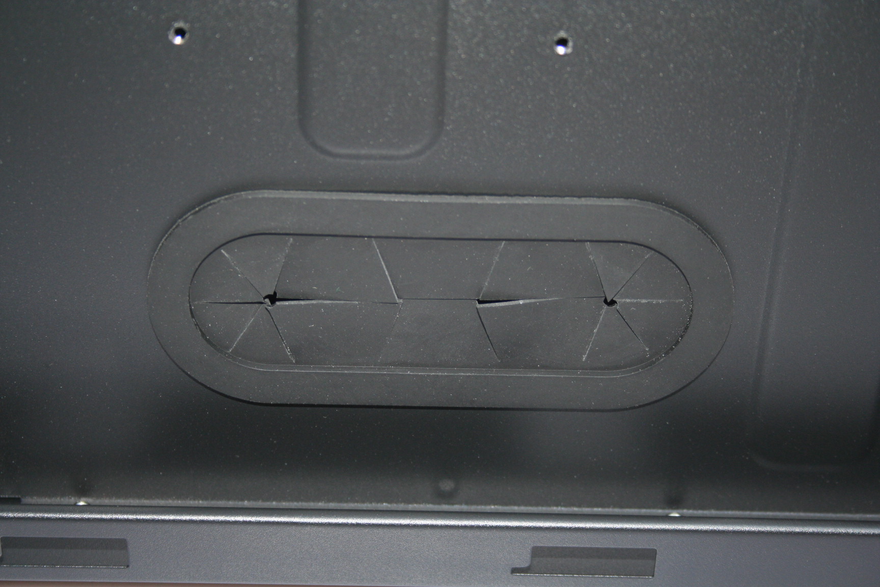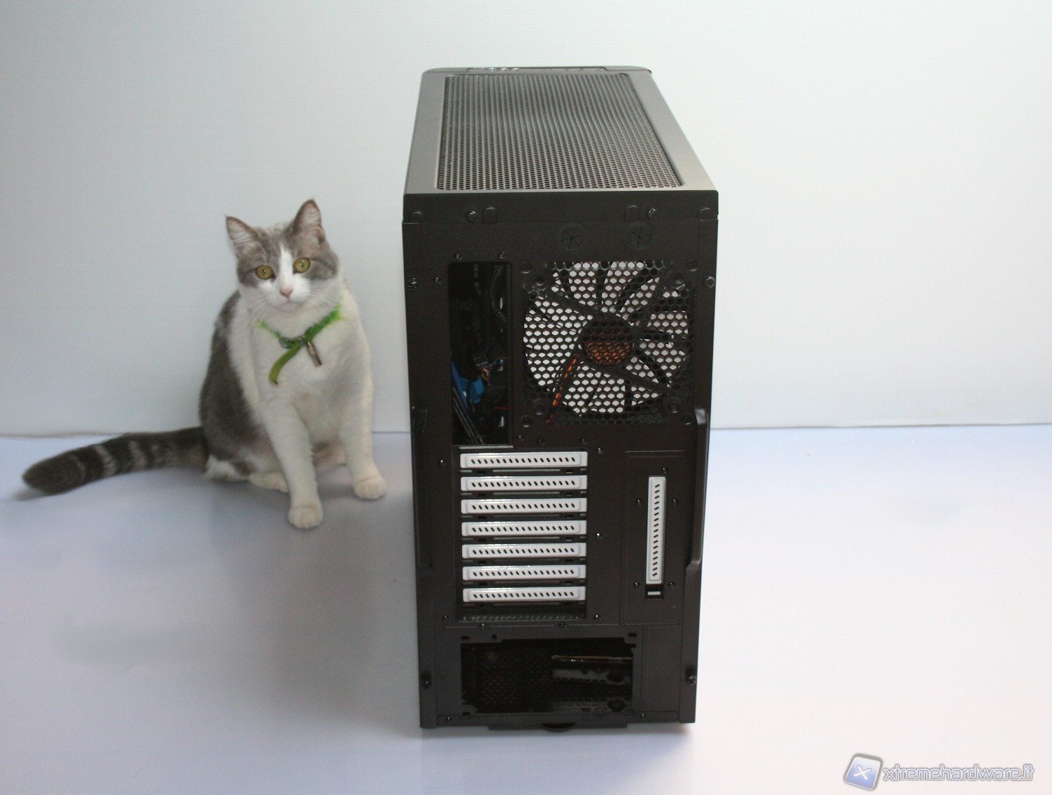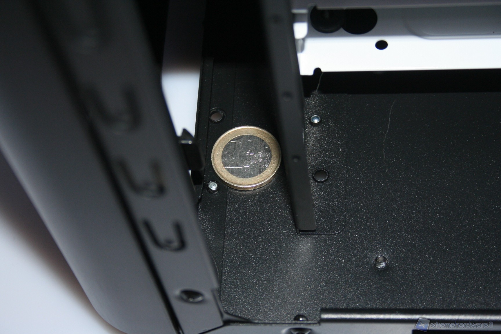 Il piatto della scheda madre è interamente in acciaio con profilati e fermacavi integrati; non è removibile. Nel piatto è presente una grande apertura posteriore per le procedure di installazione e siamo rimasti piacevolmente colpiti per il diametro dell’apertura, di generosissime dimensioni. Numerose le aperture  laterali per il passaggio dei cavi, munite di protezioni in gomma. Troviamo i classici 7 slot PCI ventilati, anch’essi di colore bianco e fissati tramite thumbscrew.