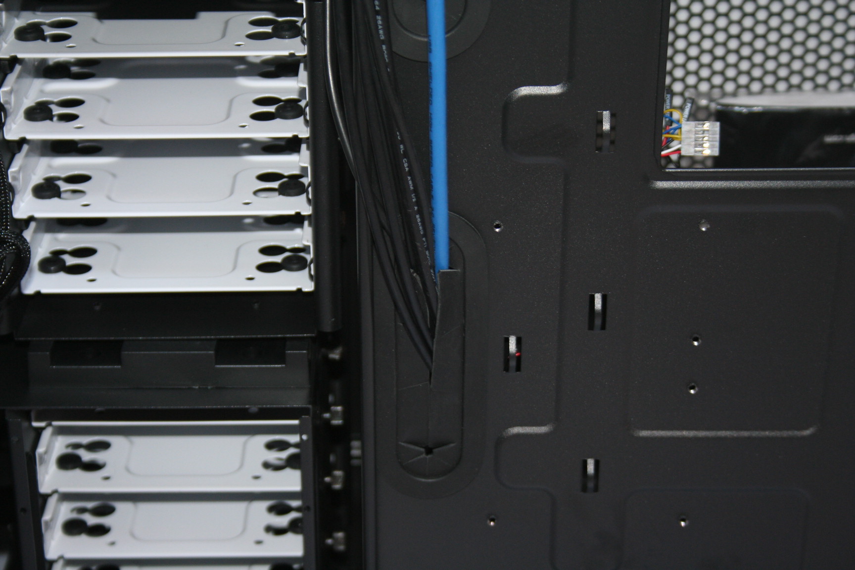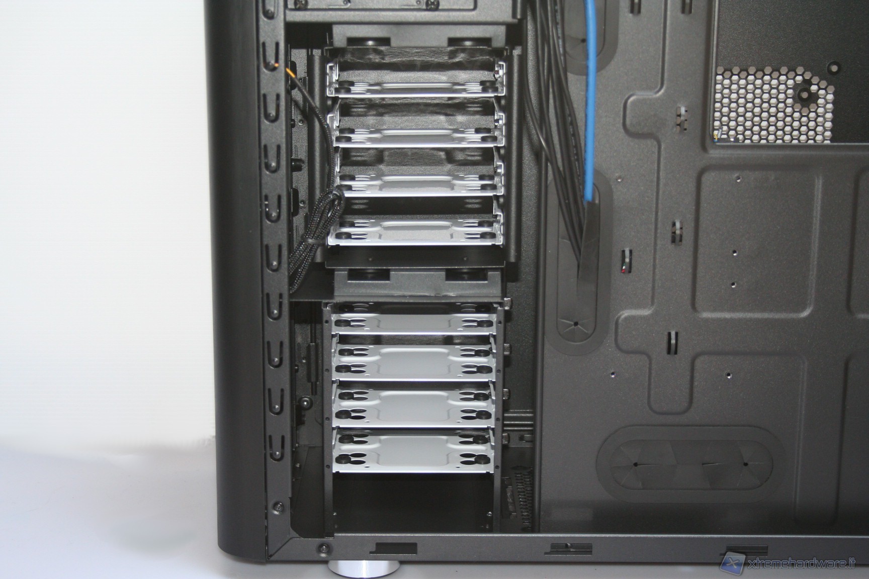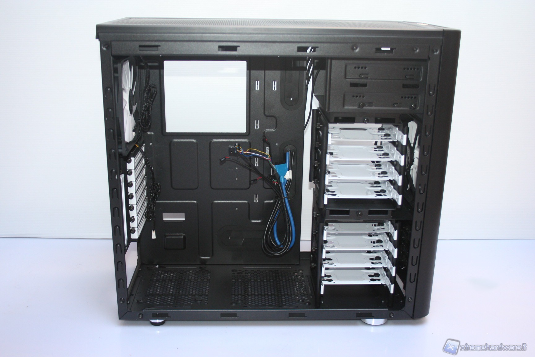 Aperta la parte laterale destra possiamo osservare la grande apertura per l’installazione di sistemi di ritenzione avanzati, per dissipatori aftermarket. Risulta essere elevatissimo lo spessore, il che significa che sarà possibile effettuare un cablaggio eccellente. Sono presenti molti rilievi e profili per il passaggio dei cavi, ben tre grandi guaine gommate, molto spesse e resistenti alle sollecitazioni, inferiori e centrali per il passaggio dei cavi e due superiori. Elevato anche lo spazio presente dietro agli hard disk, facilitando il cablaggio degli stessi. Non sono presenti ventole posteriori, ma tale aspetto è semplicemente intenzionale, perché i dischi rigidi sono già dissipati frontalmente. La solidità strutturale risulta essere molto elevata.