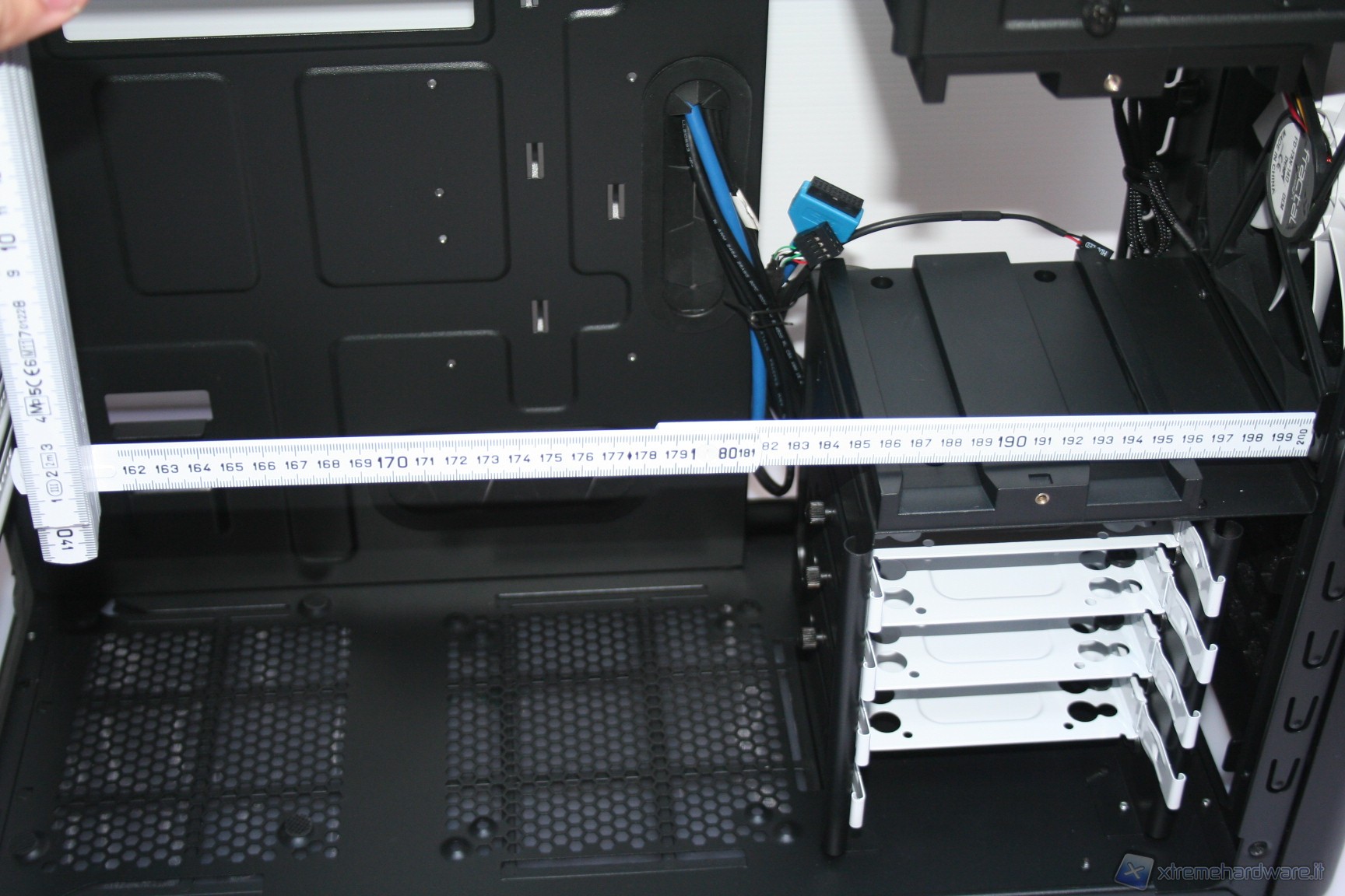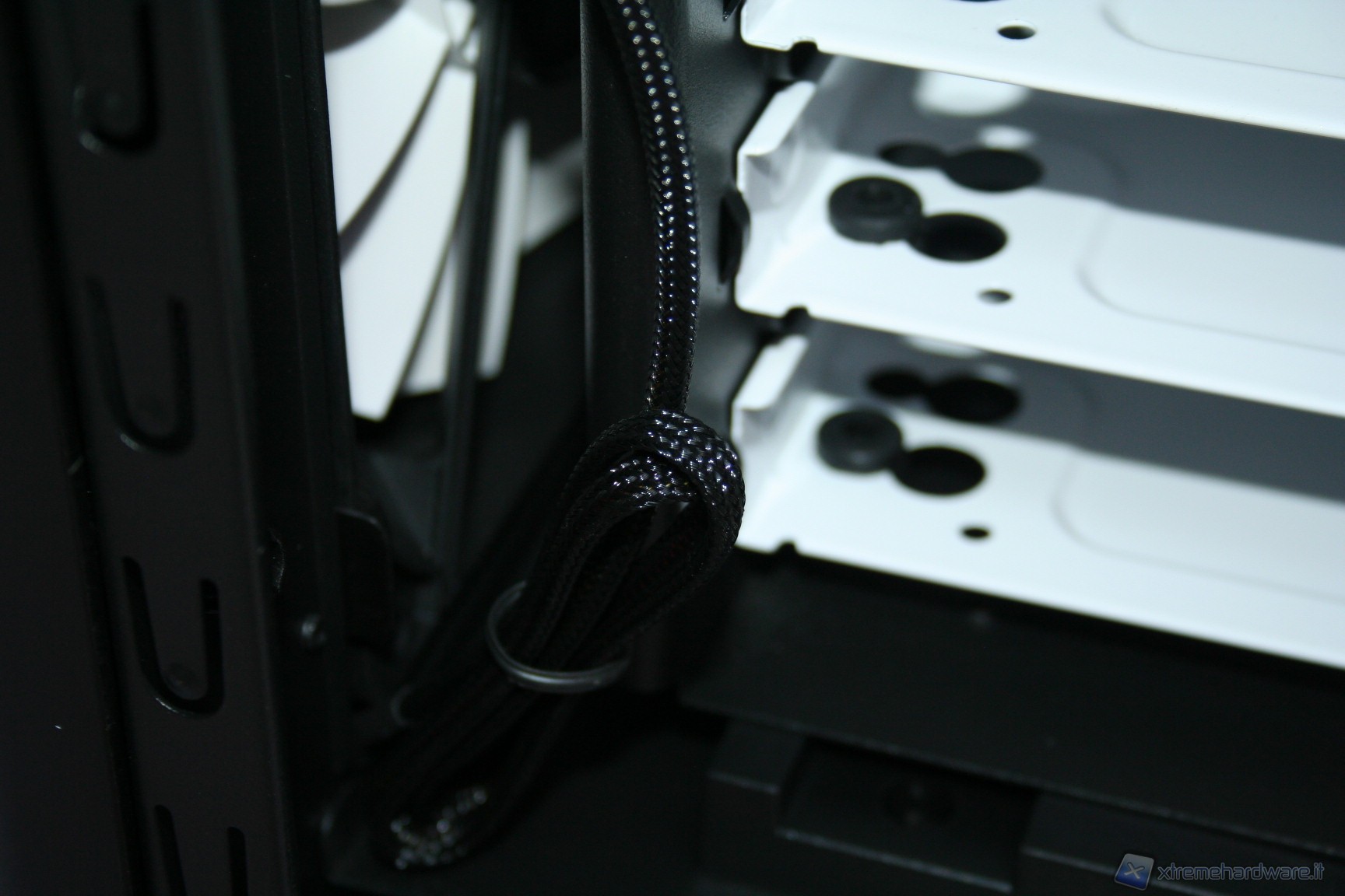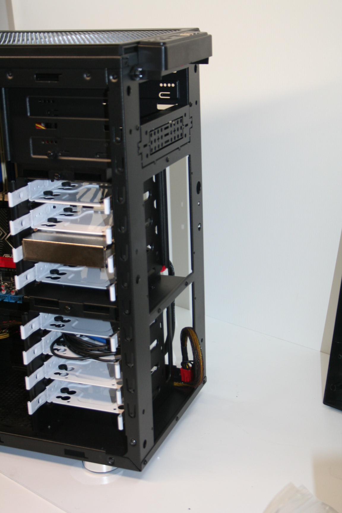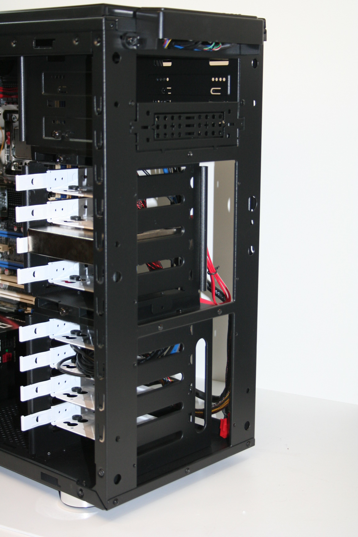 Aperta la parte laterale destra possiamo osservare la grande apertura per l’installazione di sistemi di ritenzione avanzati, per dissipatori aftermarket. Risulta essere elevatissimo lo spessore, il che significa che sarà possibile effettuare un cablaggio eccellente. Sono presenti molti rilievi e profili per il passaggio dei cavi, ben tre grandi guaine gommate, molto spesse e resistenti alle sollecitazioni, inferiori e centrali per il passaggio dei cavi e due superiori. Elevato anche lo spazio presente dietro agli hard disk, facilitando il cablaggio degli stessi. Non sono presenti ventole posteriori, ma tale aspetto è semplicemente intenzionale, perché i dischi rigidi sono già dissipati frontalmente. La solidità strutturale risulta essere molto elevata.