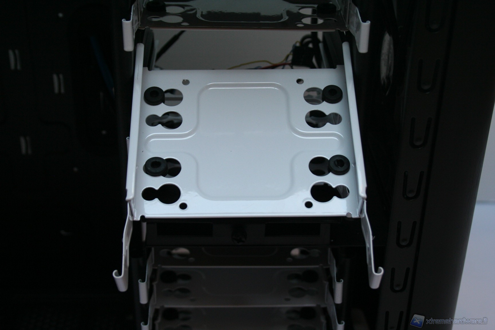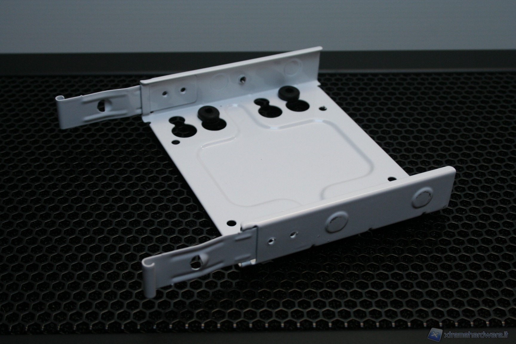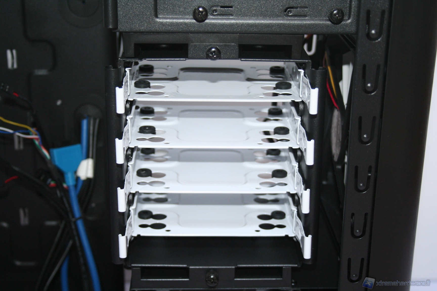 La gestione degli slot da 5.25” è interessante perché sono presenti due cage, uno dei quali removibile, che supportano fino ad 8 dischi da 3.5” e 2.5”. Ottimi i profili gommati e la solidità della struttura, come eccellente è la colorazione bianca, nella stessa tonalità delle pale delle ventole e degli slot PCI. Purtroppo non è presente un sistema hot-swap quindi consigliamo a Fractal Design di implementarlo in futuro; un altro piccolo punto a sfavore è il sistema di blocco dei dischi, che richiede sempre viteria dedicata. Consigliamo l’adozione di un sistema simile ai cage per HD proprietari della Zalman, con meccanismi di blocco a scorrimento orizzontale, tool-less. E’ buona quindi la gestione dei dischi, soprattutto a livello di dissipazione termica; ricordiamo che c’è la predisposizione per un’altra ventola da 140mm nella parte frontale inferiore,, che permetterà quindi un’ottima aerazione interna anche sulla scheda video. Vogliamo far presente che forse una sola ventola da 140mm in immissione è insufficiente, come vedremo per quanto riguarda soprattutto la CPU e la scheda video. Comunque sia è un discorso irrilevante dato che potrete montare molte altre ventole, sia nella parte superiore, che frontale, inferiore e laterale. Classico, e scomodo il montaggio delle soluzioni da 5.25”, ma è una soluzione che premia indubbiamente la stabilità delle componenti ivi posizionate.