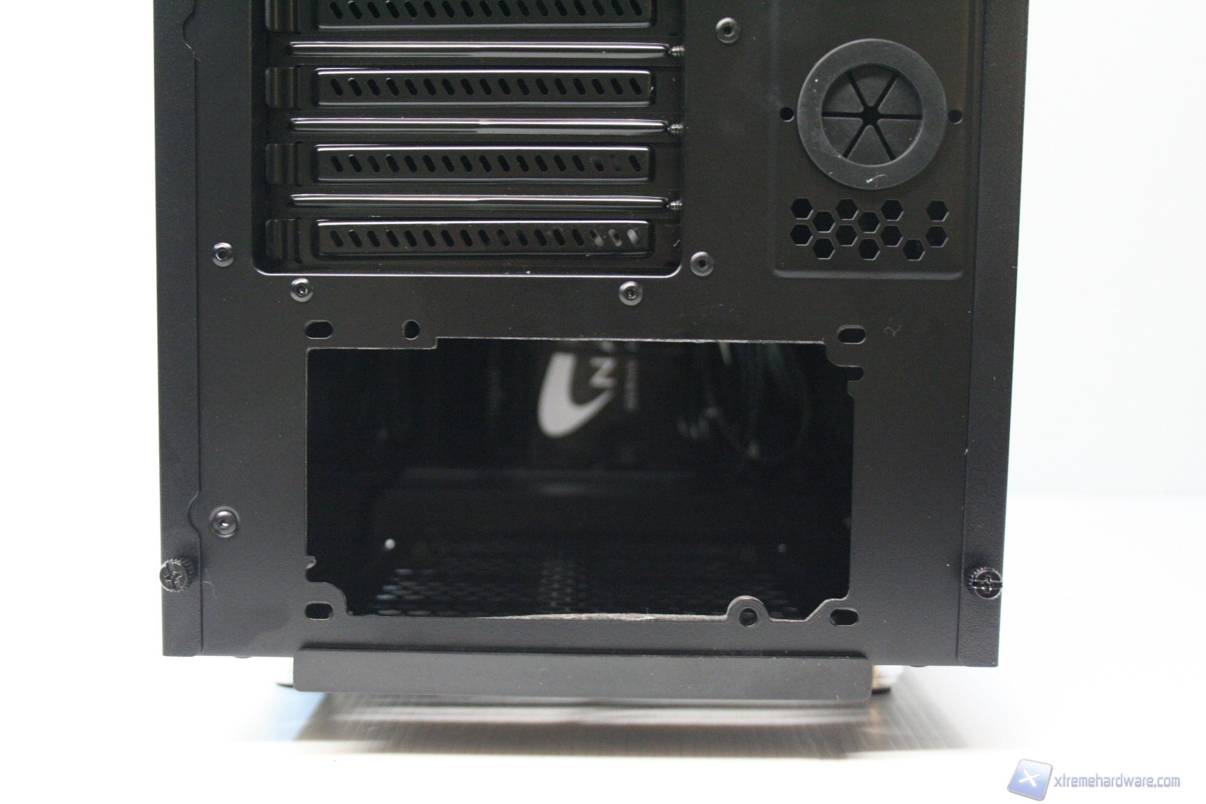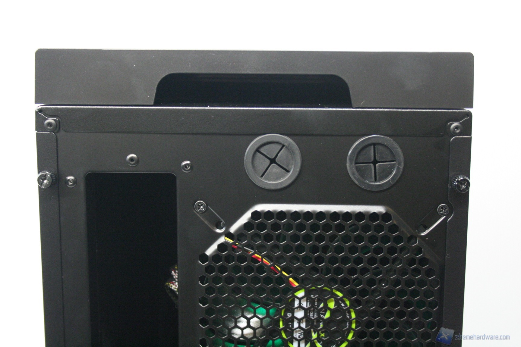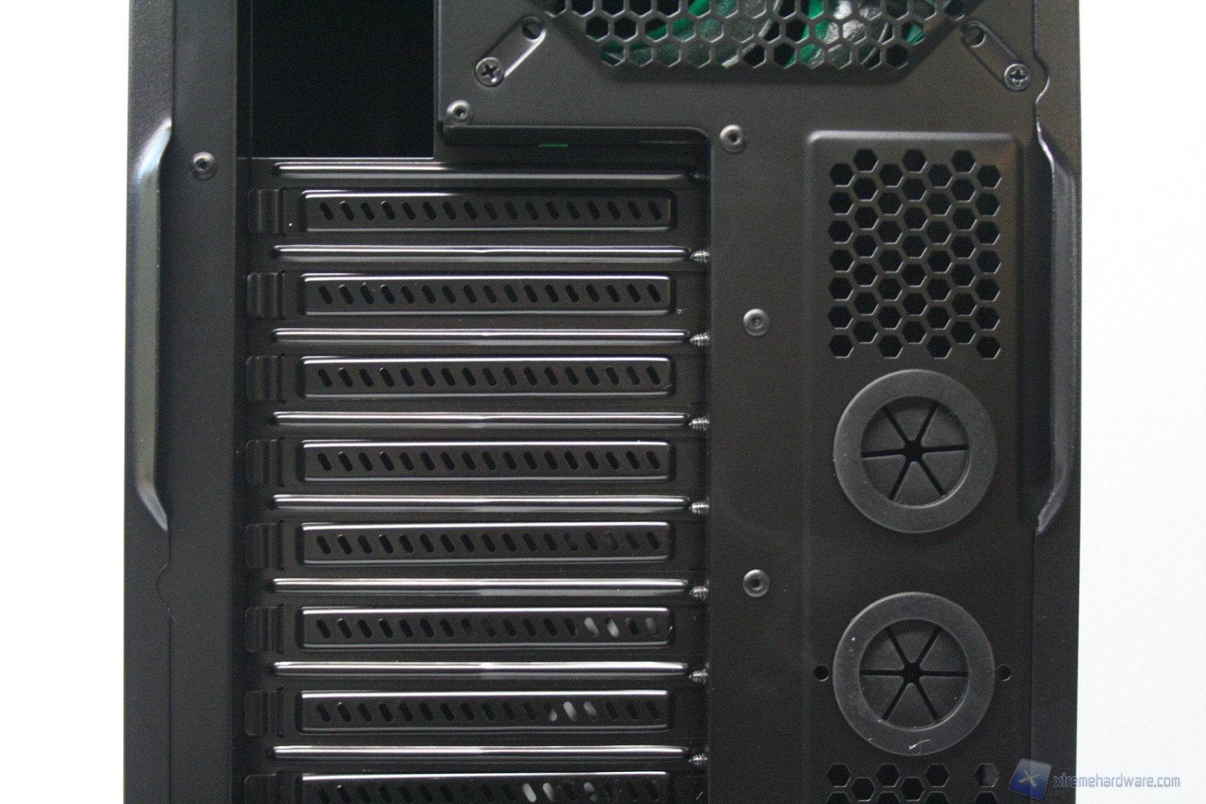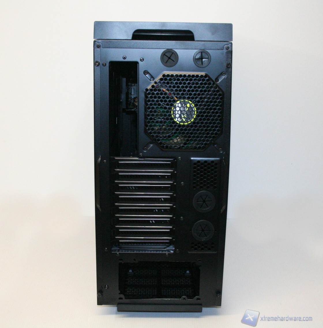 Posteriormente abbiamo una configurazione classica, ma maggiorata, con alimentatore nella parte inferiore, 8 slot di espansione PCI che presentano delle aperture d’aerazione, due grandi fessure per l’installazione di tubazioni a liquido nella parte laterale e due piccole nella parte superiore, la predisposizione per una ventola da 120/140mm (è preinstallata una 140mm) ed infine sono presenti delle aperture laterali per la ventilazione passiva del cabinet. Da notare il filtro antipolvere nella parte inferiore.