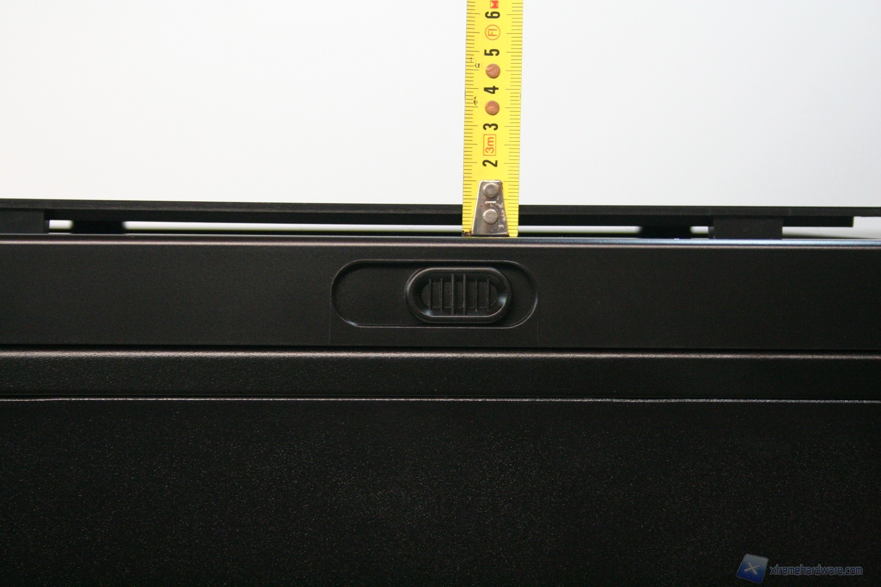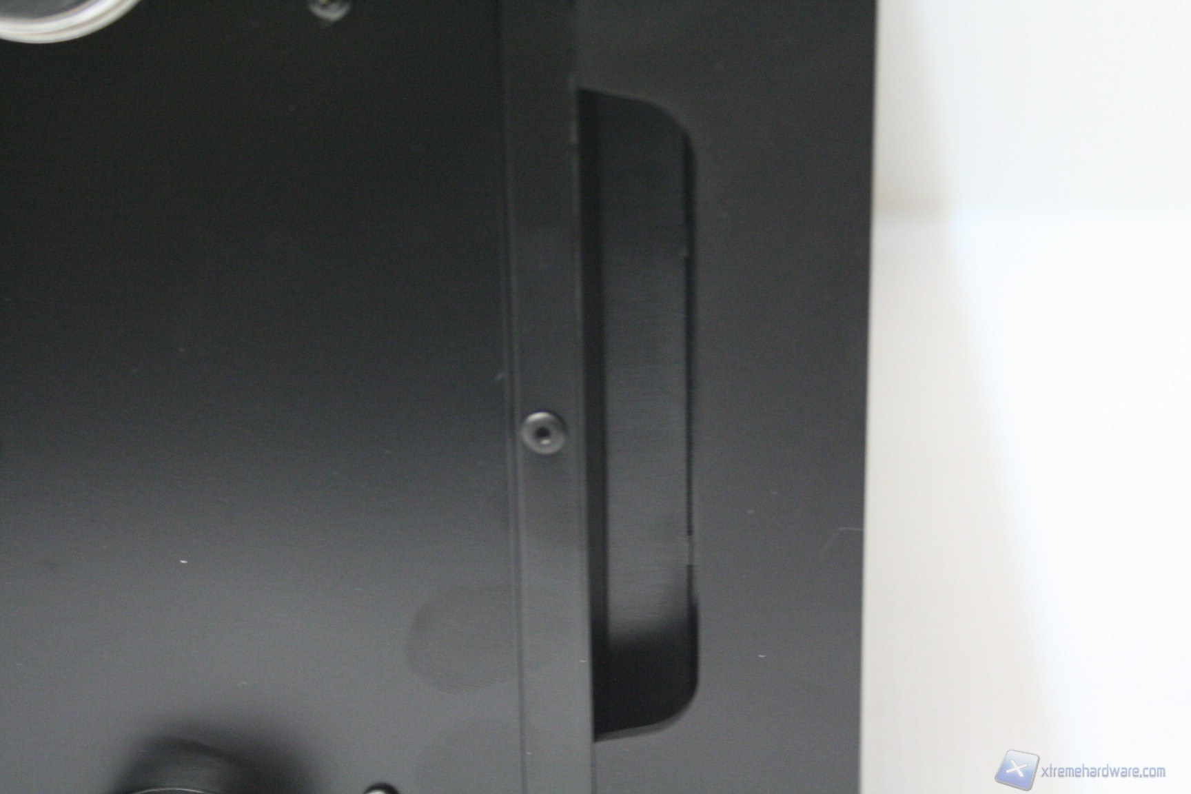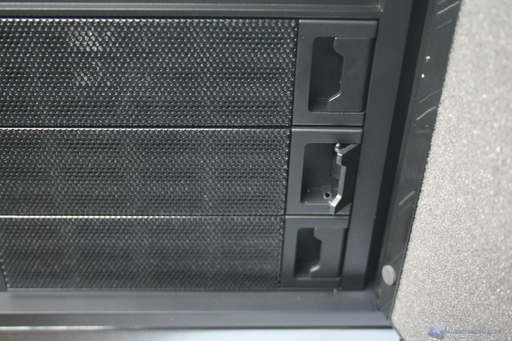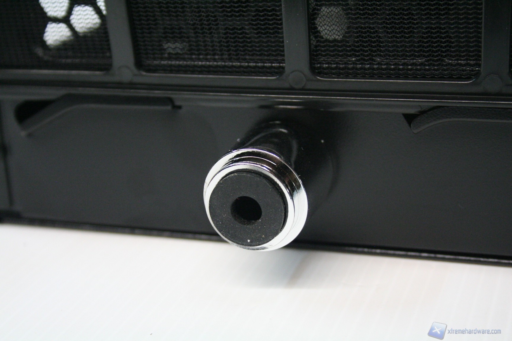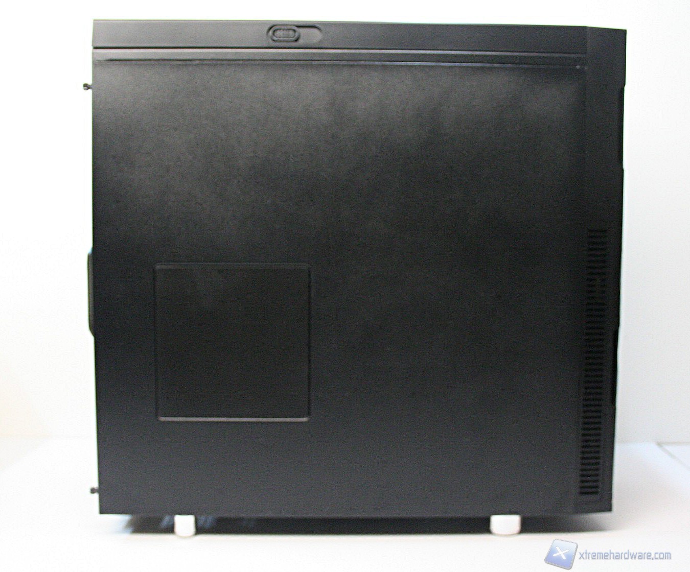 Posteriormente abbiamo una configurazione classica, ma maggiorata, con alimentatore nella parte inferiore, 8 slot di espansione PCI che presentano delle aperture d’aerazione, due grandi fessure per l’installazione di tubazioni a liquido nella parte laterale e due piccole nella parte superiore, la predisposizione per una ventola da 120/140mm (è preinstallata una 140mm) ed infine sono presenti delle aperture laterali per la ventilazione passiva del cabinet. Da notare il filtro antipolvere nella parte inferiore.