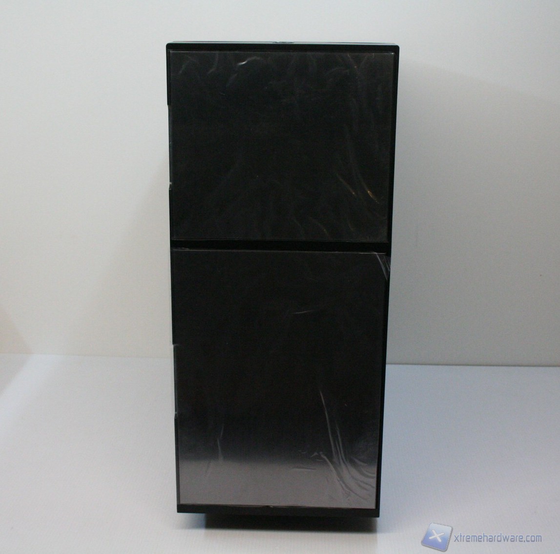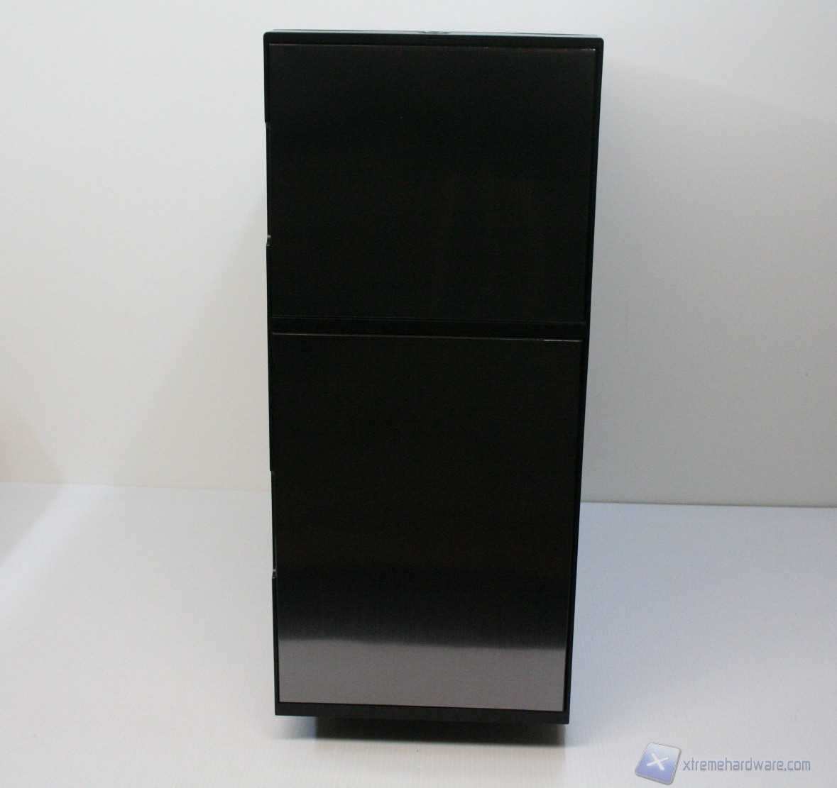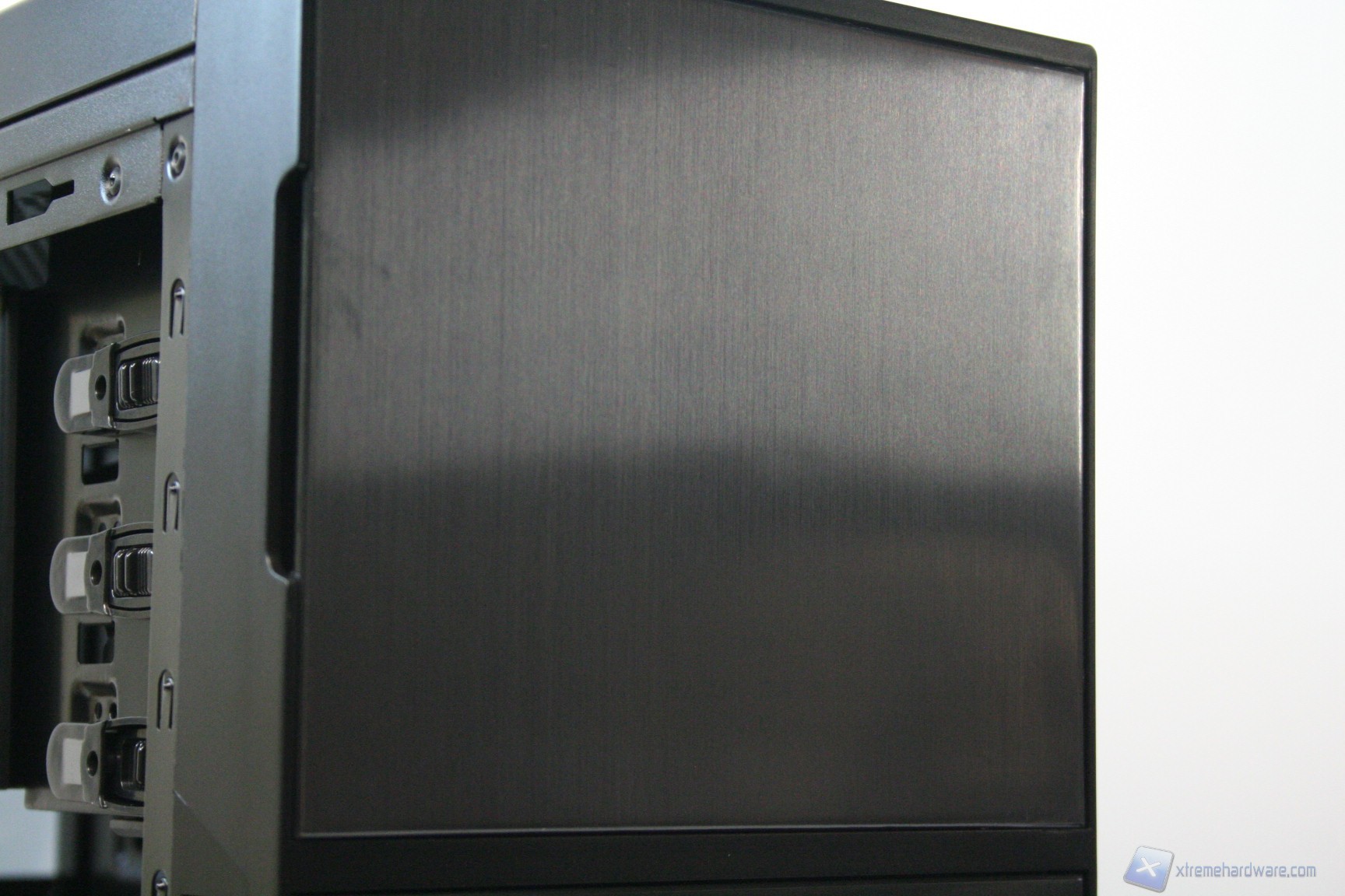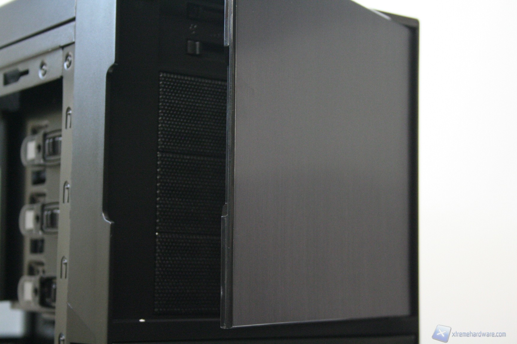 La parte frontale è caratterizzata da una struttura in plastica dura con finitura spazzolata e riflettente, che presenta colori diversi in base al modello esatto. La paratia è apribile, in quanto è uno sportello ad apertura laterale. Questo permette l’installazione di due ventole da 120mm nella parte sottostante, di un praticissimo filtro antipolvere a rimozione frontale, con un sistema a pressione, oltre ad una facile installazione di periferiche da 5.25” nella parte superiore, tre in totale, con un meccanismo di apertura resistente e moderno. La finitura, come la realizzazione, sono ottime.