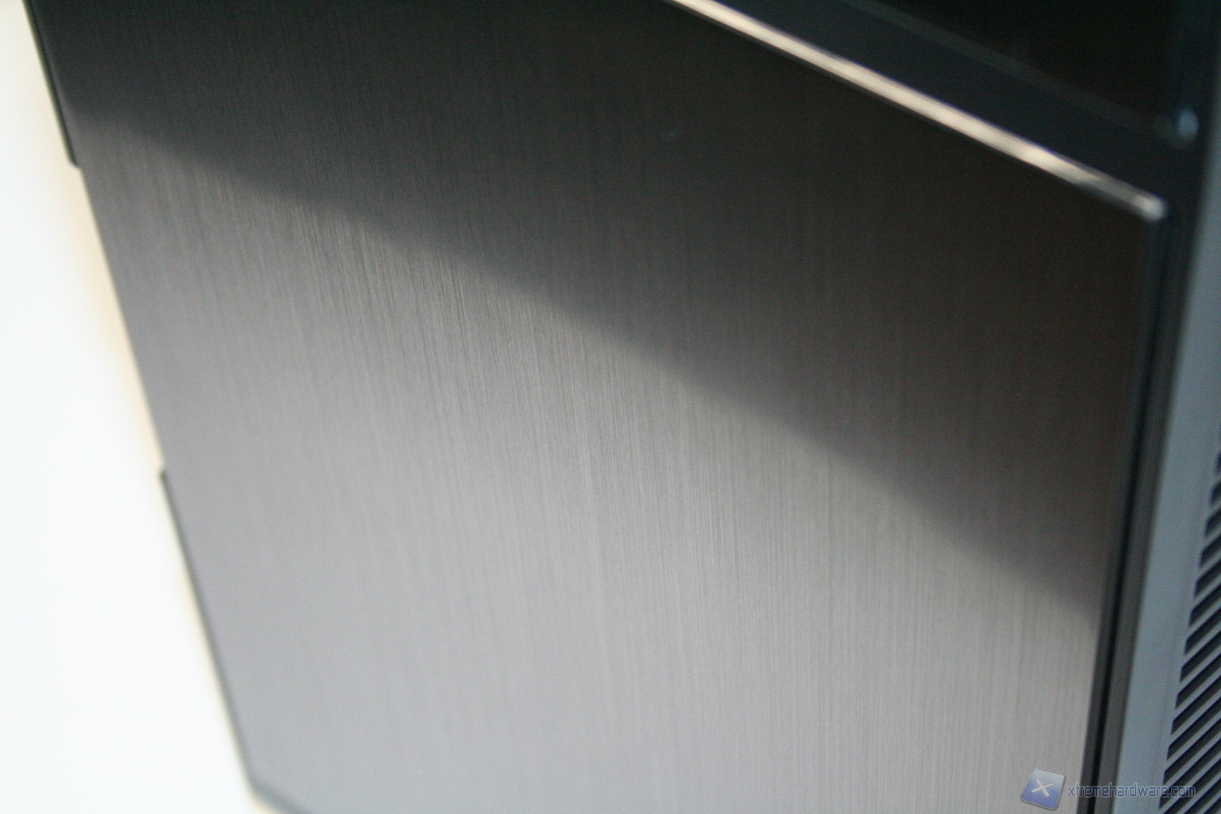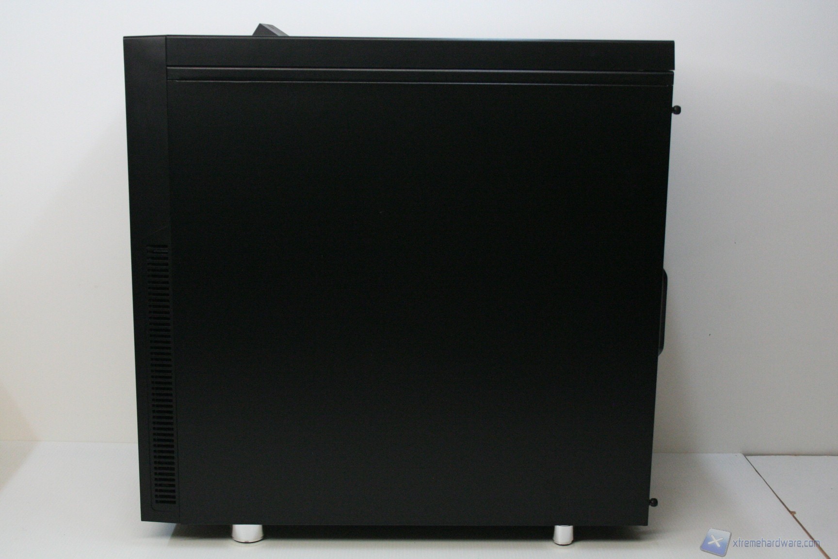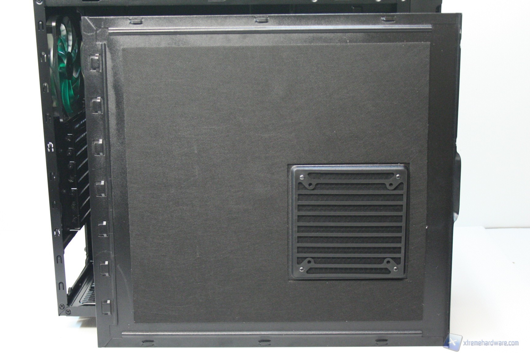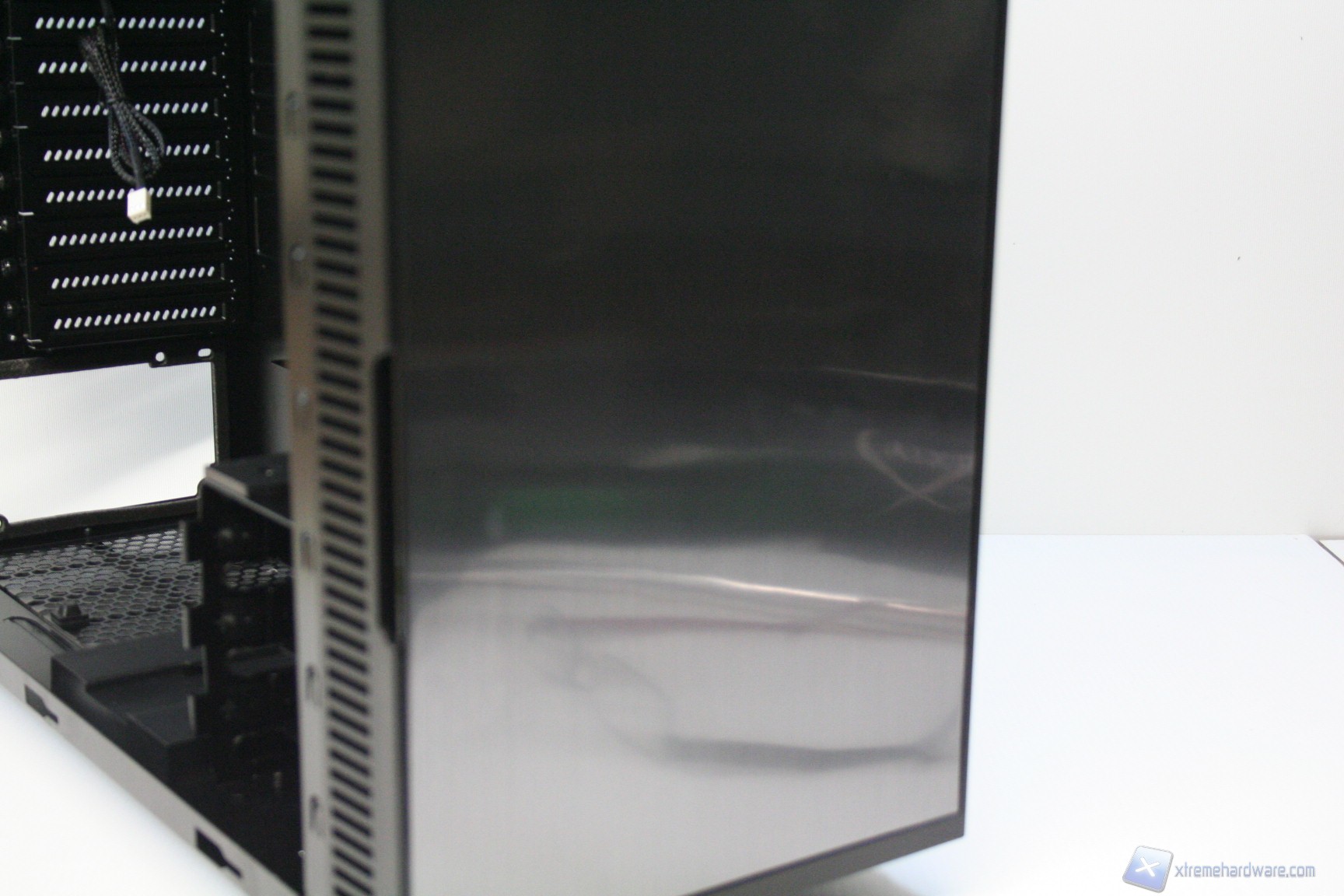 Il cabinet presenta un sistema di gestione delle paratie laterali classico, con paratie interamente in acciaio. Quella di destra presenta un foro per l’installazione di una ventola da 120mm, anche se a default è coperto da un pannello fonoisolante. Nella parte sinistra non sono presenti fori o particolarità degne di menzione, se non la finitura del pannello stesso, che sarà prona a impronte digitali. Da notare l’illuminazione, per capire meglio la finitura dei pannelli e la verniciatura degli stessi.